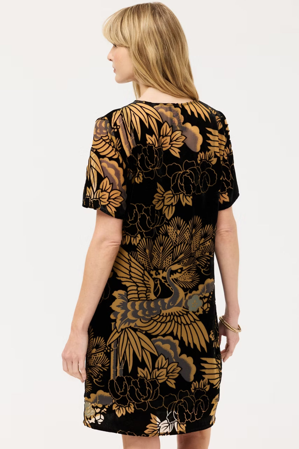 Boldly embellished with a metallic burnout pattern, the Modet Short Dress is adorned with vibrant flora and fauna. Designed with a keyhole front with a button loop closure, this slip-lined shift dress is finished with shorts sleeves and a straight hemline. Pair with metallic heels and stunning gold jewelry for a polished evening look.