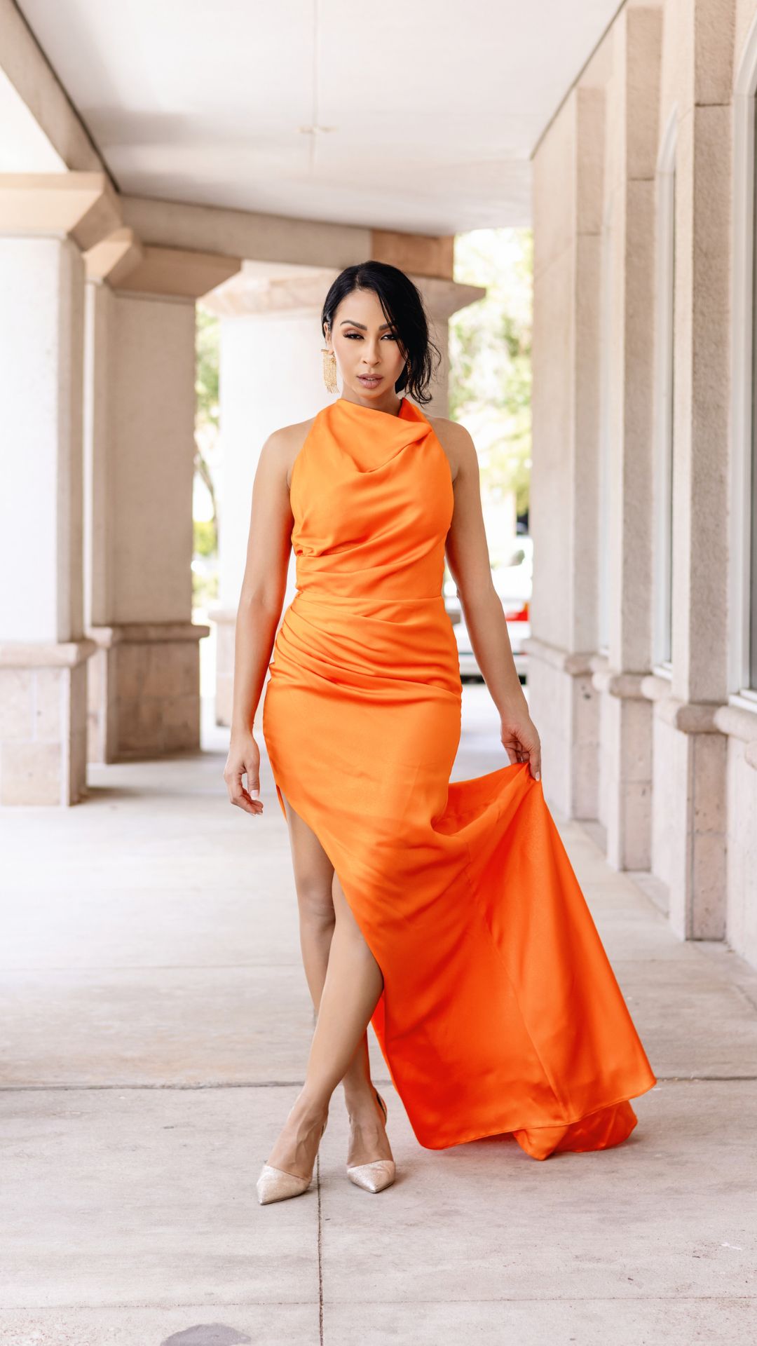 The Monarch Gown is an exquisite halter dress crafted with a mid-weight luxury fabric. This stunning dress features a cowl neck design with two buttons on the neck, and low back fabric with a metallic hint for added allure. The ruched hips slenderize the figure and create a flattering silhouette, while the thigh slit offers subtle sensuality.
