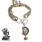 Moon Crater is made with our brushed silver metal knotted beads, silver circles, and a toggle. 18" long. The pendant is a druzy geode in the shape of a half moon with a face. Some stones have the geode craters and some do not.