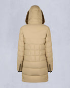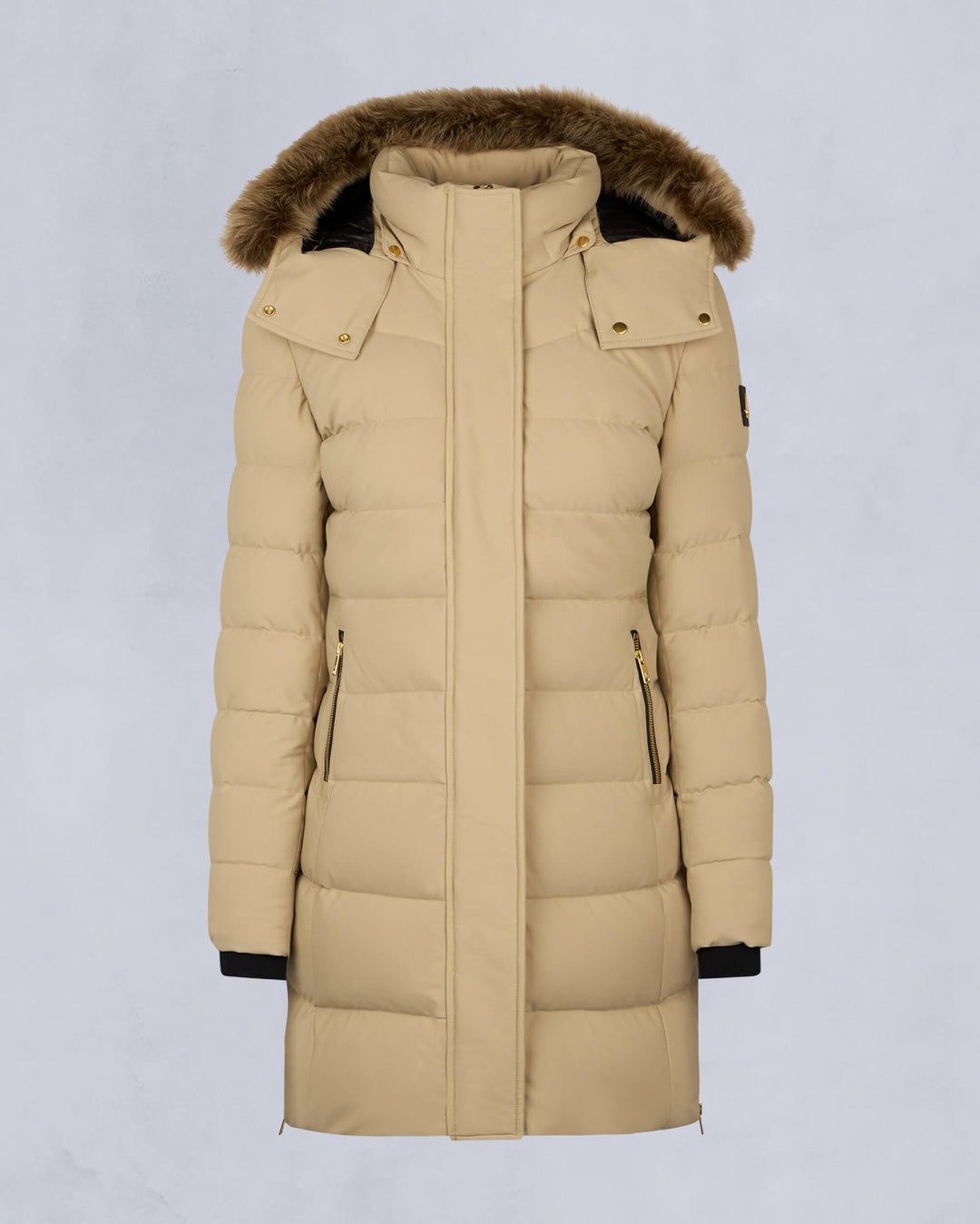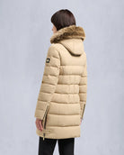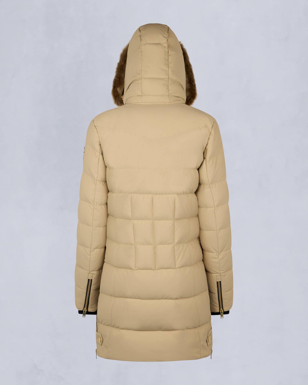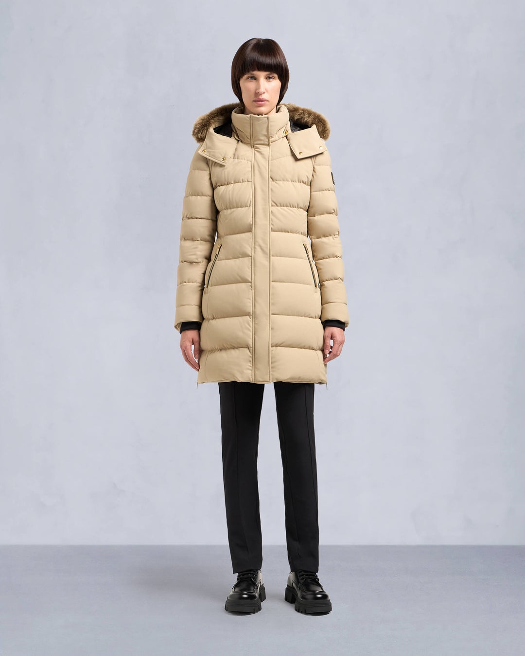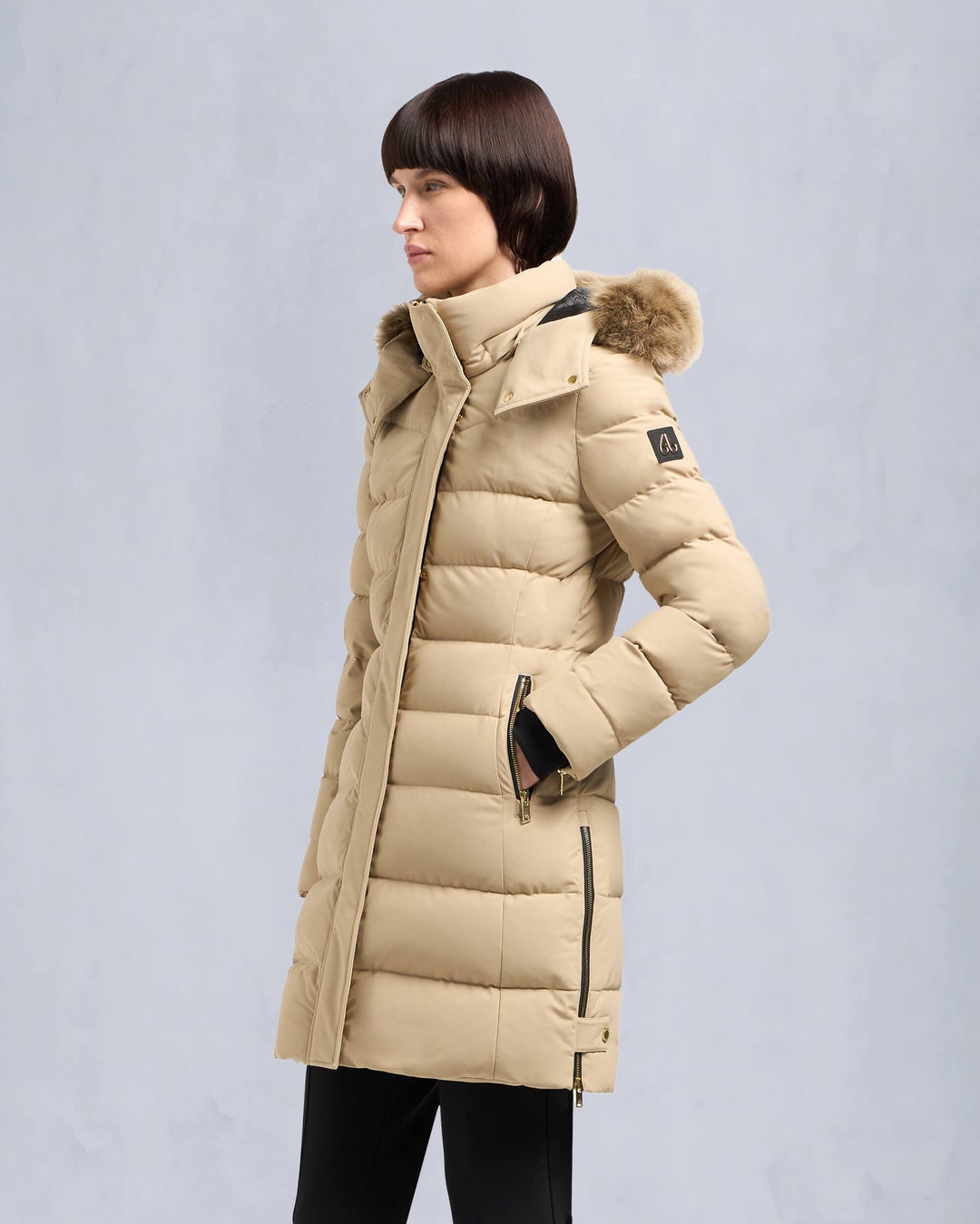 Stay warm and stylish in our ultralight shearling parka. Designed for comfort and effortless chic, this parka is perfect for any setting. Embrace the warmth and style with our Moose Knuckles Womens Gold Series Watershed Parka in Sand with Brown Shearling.