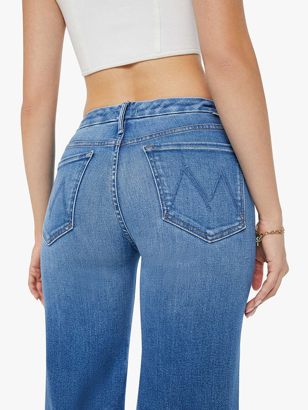 Elevate your wardrobe with the Mother Denim Roller Fray Jeans. This high-waisted wide leg boasts a frayed hem and stretch denim for comfort, while the mid-blue wash and subtle whiskering add a timeless touch. Whether working or playing, these jeans are perfect for any occasion. Unleash your denim dreams with the Roller Fray Jean.