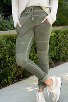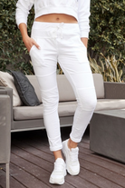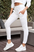 Solid White Lightweight Ankle length Moto Joggers with Drawstring. These are cuffed for a cropped look.