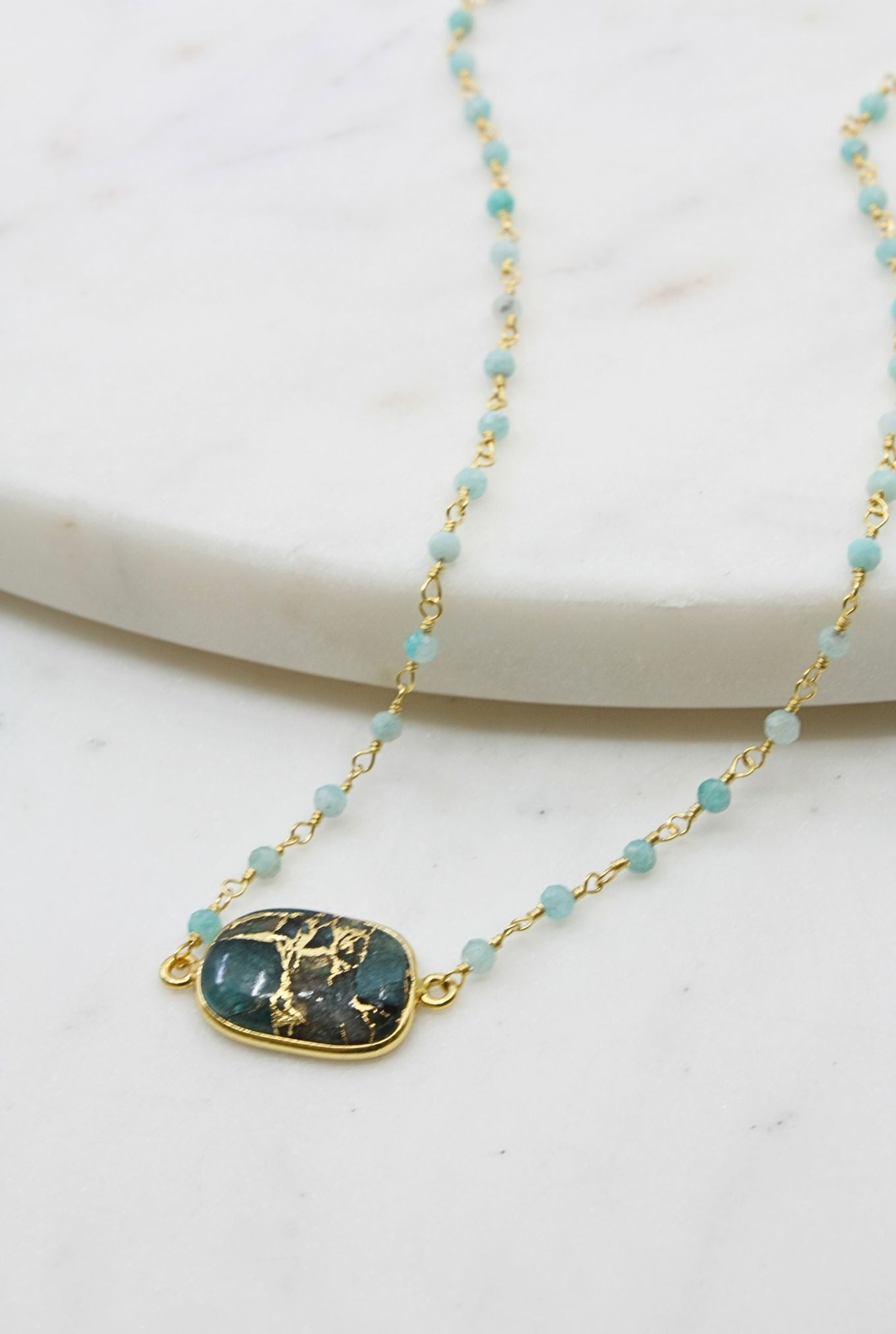 Our endless summer Mrs. Parker necklace quth a teal turquoise mojave stone and amazonite chain.