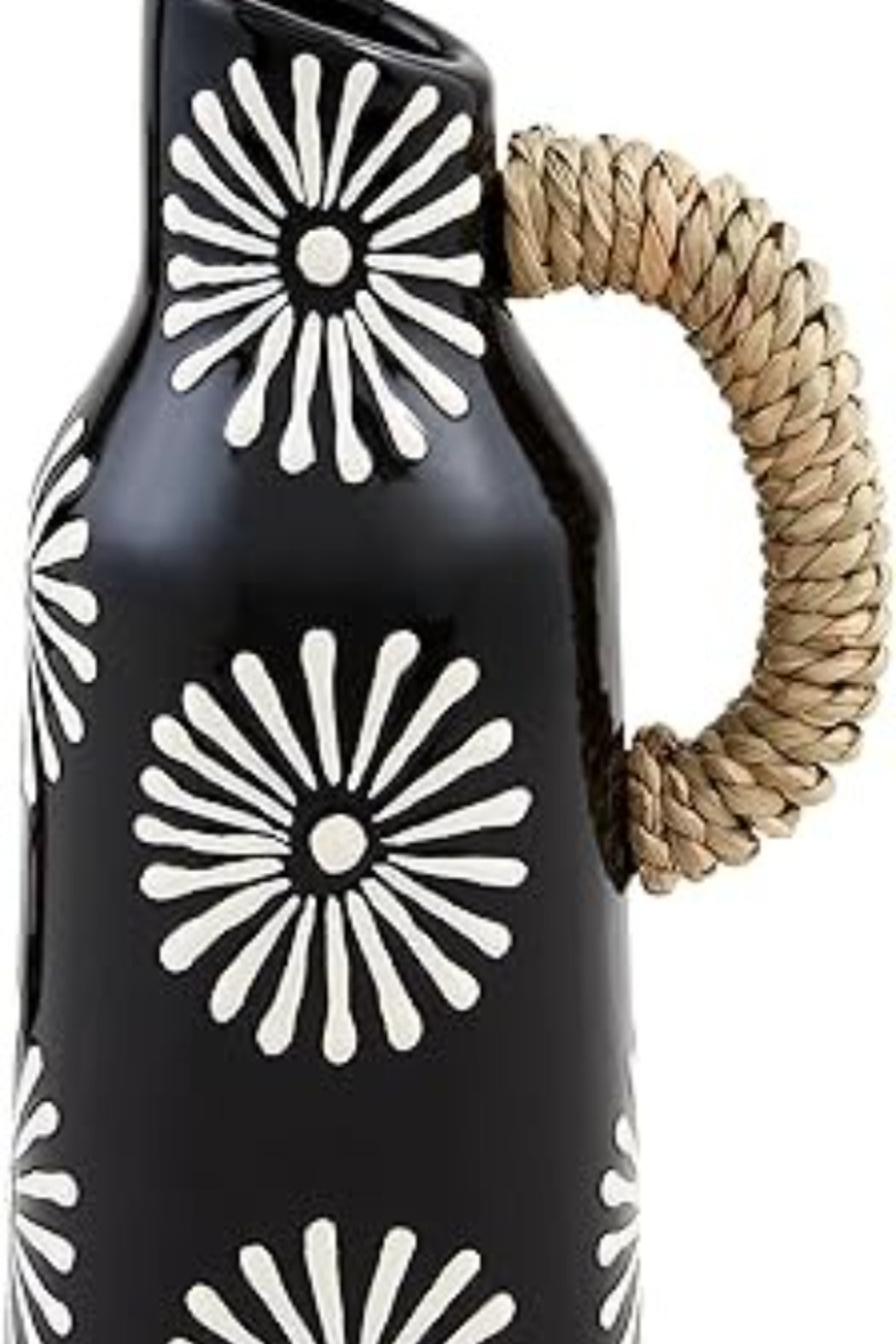 "This Medium Patterned Bud Vase is a stunning glazed ceramic pitcher-style vase with a jute wrapped handle