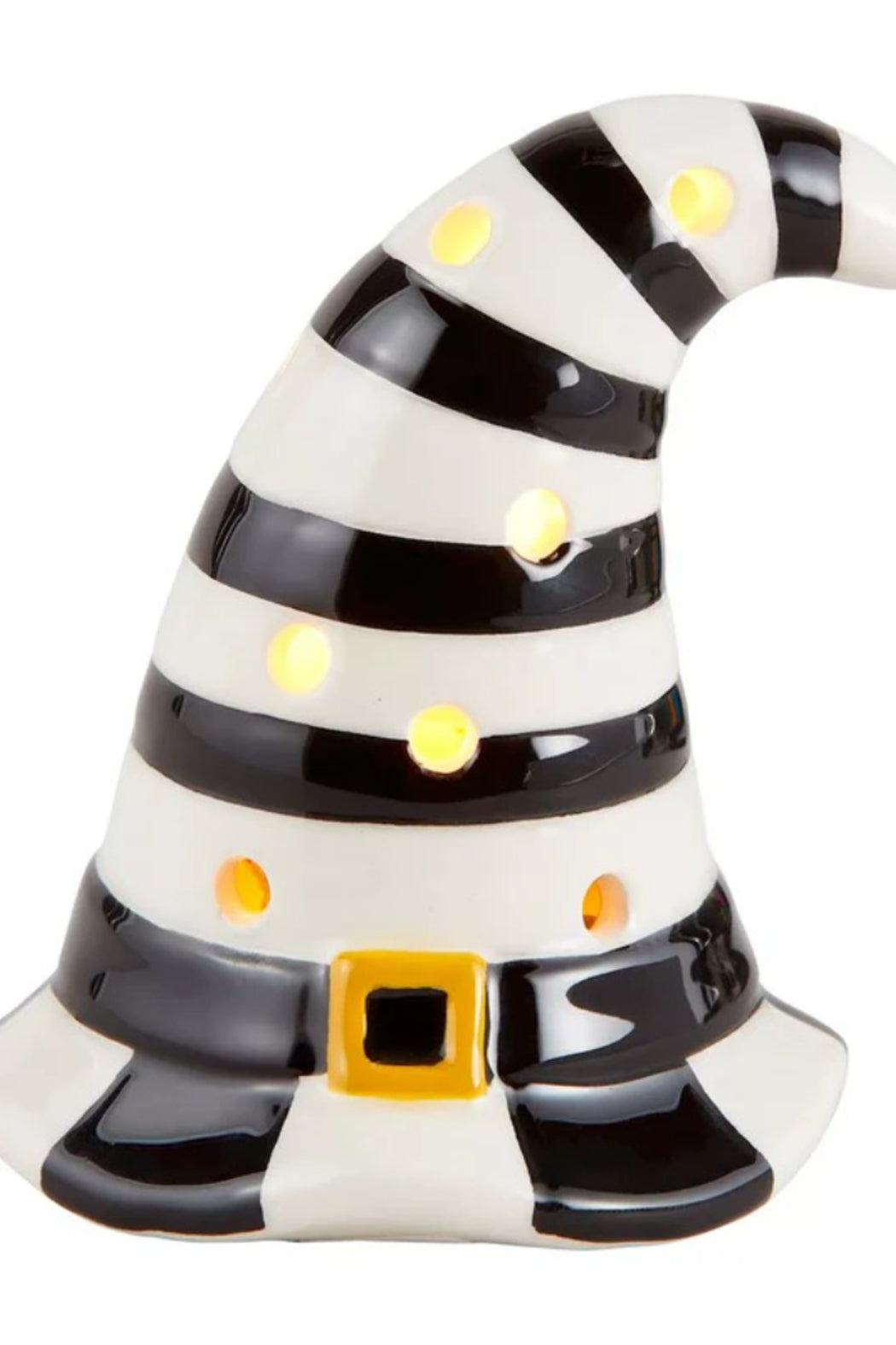 The Witch Hat Light-Up Sitter is a ceramic sitter that is perfect for adding a touch of spooky ambiance to your Halloween decor. With its cut-out detail, this sitter allows the LED lights inside to shine through, creating an eerie glow that is sure to catch everyone's attention. Not only does it light up, but it also emits spooky sounds, adding an extra layer of fright to your Halloween display. Made from high-quality dolomite, this sitter measures 4 1/2"" in height and has a diameter of 2 3/4"", making it the perfect size to sit on a shelf, table, or mantel. Whether you're hosting a Halloween party or simply want to add some festive flair to your home, the Witch Hat Light-Up Sitter is a must-have decoration."