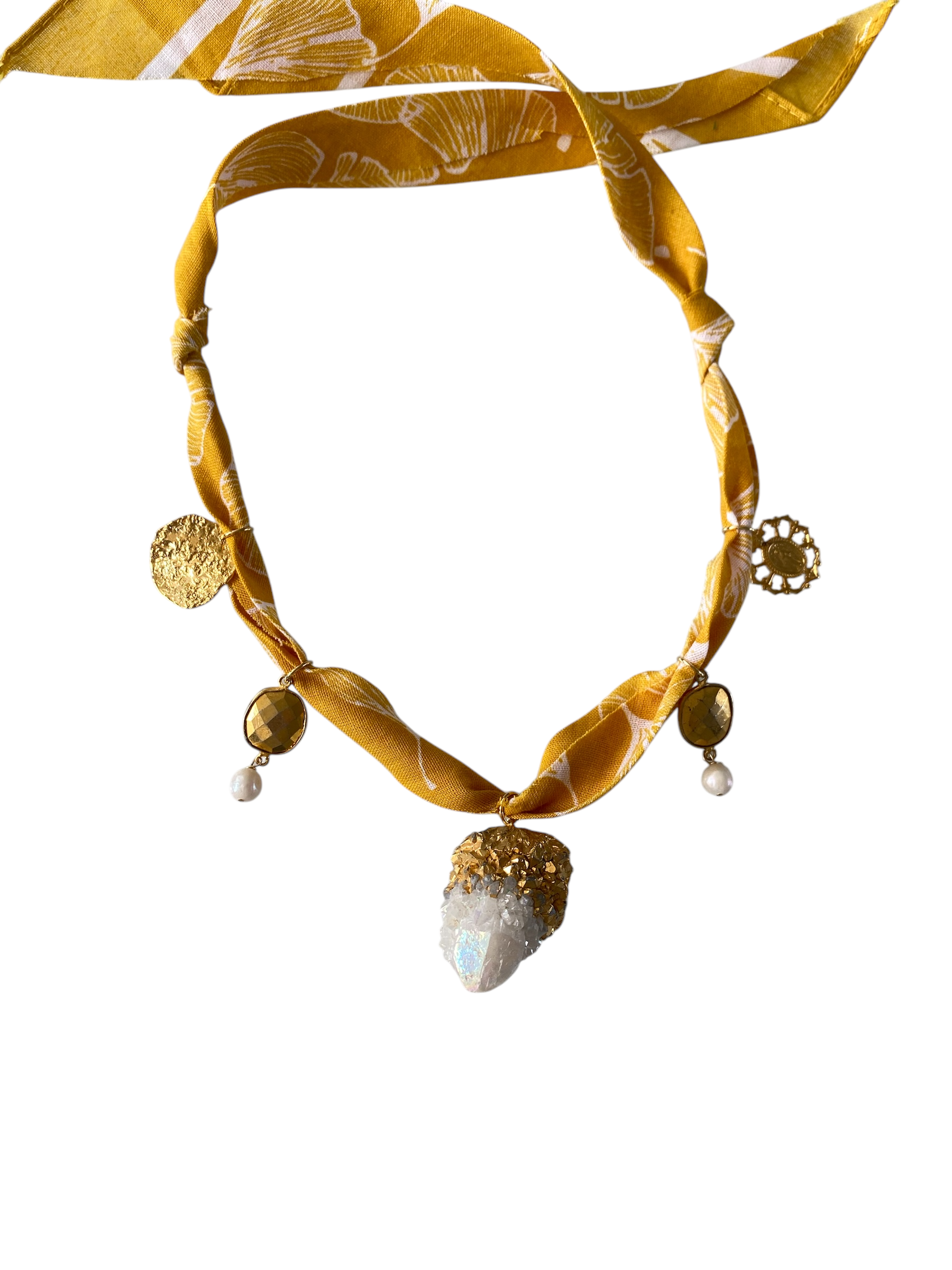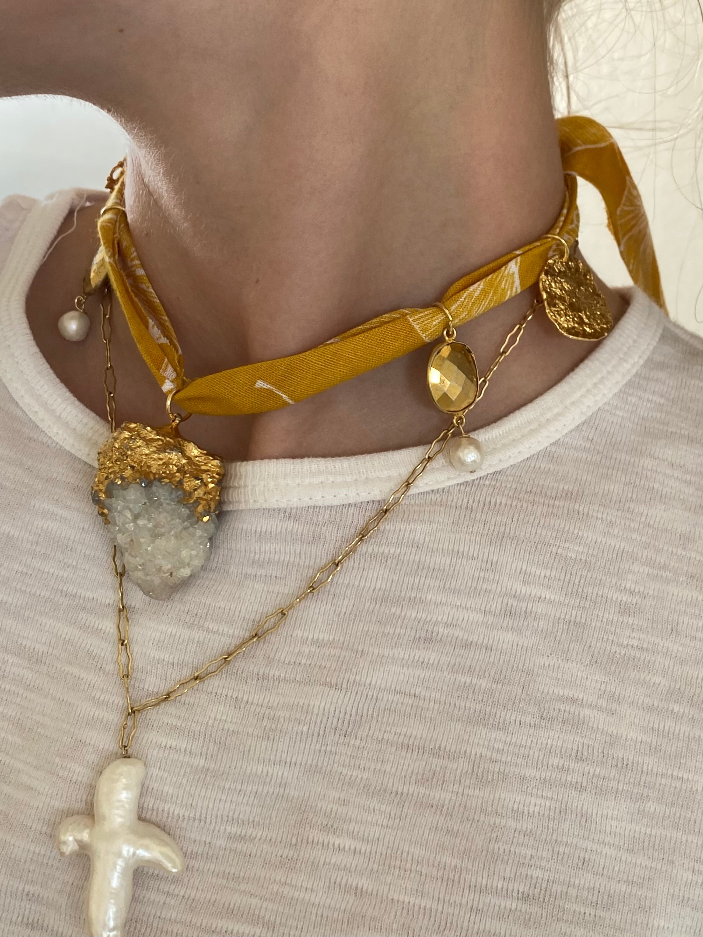 The Mustard Bandana Necklace is a bold, multifunctional piece that captures free-spirited, country-inspired style. Crafted from 18K gold-plated material and accented with quartz and freshwater pearls, it adds a warm, rustic touch to any look. Wear it as a necklace, wrap it around your wrist or leg, style it on your purse or belt — or even add it to your hat for a one-of-a-kind statement that’s effortlessly chic.