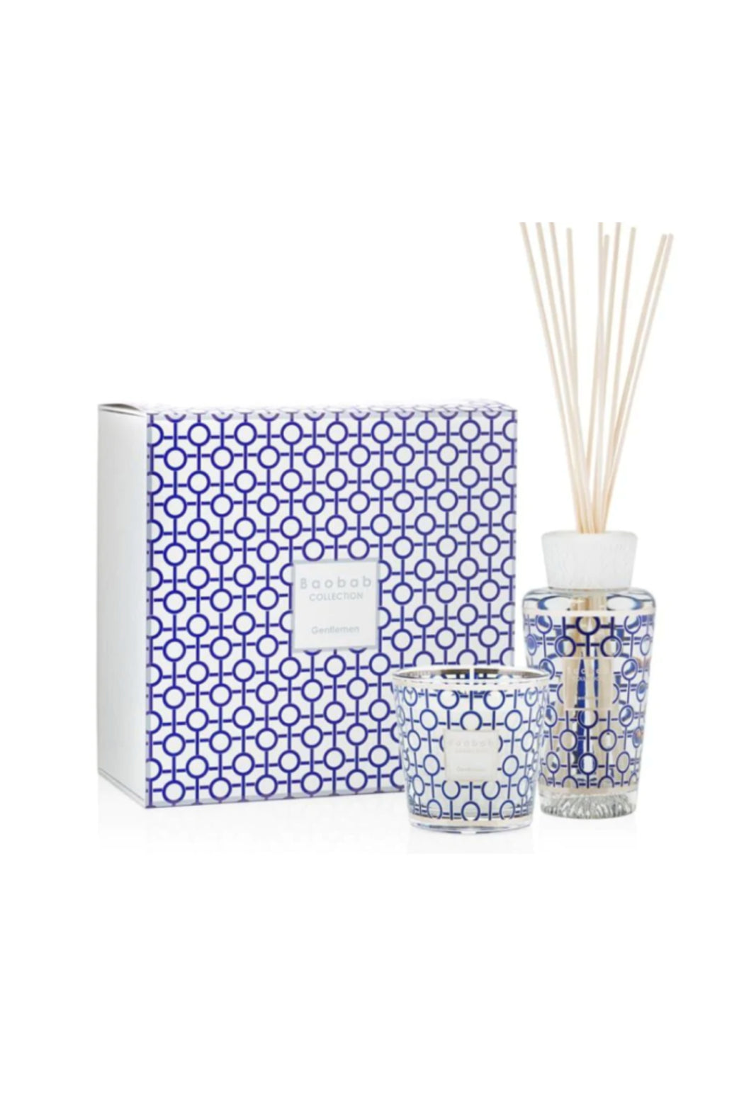 Men: Presented in a glass decorated in platinum and ultramarine, these sets make perfect gifts for gentlemen. The perfume of rum, saffron and labdanum in the diffuser and scented candle gift set is a truly masculine scent and totally irresistable.