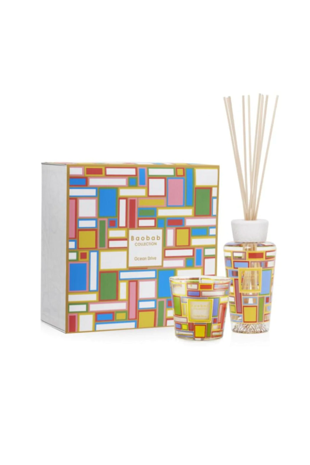 Ocean Drive:The Ocean Drive scented candle and fragrance diffuser are decorated with a graphic screen print inspired by the artist Peter Halley. The design of this candle and this diffuser is an abstract interpretation of the neon colours featured in Ocean Drive's shop windows.