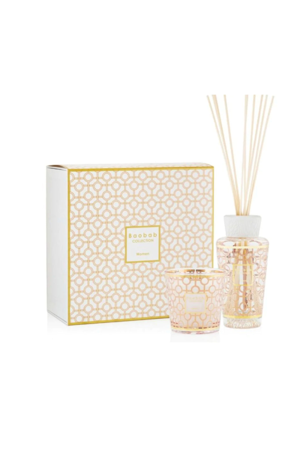 Women:Looking for luxury gifts for women? What could be more luxurious than the scented gifts in this set: a perfumed candle for her and a home diffuser, presented in glass holders decorated in gold and powder pink. The graphic design on this beautiful candle represents the feminine sign.These decorative presents have a perfume of rose powder and musk, giving a thoroughly feminine scent to this beautiful candle gift set.