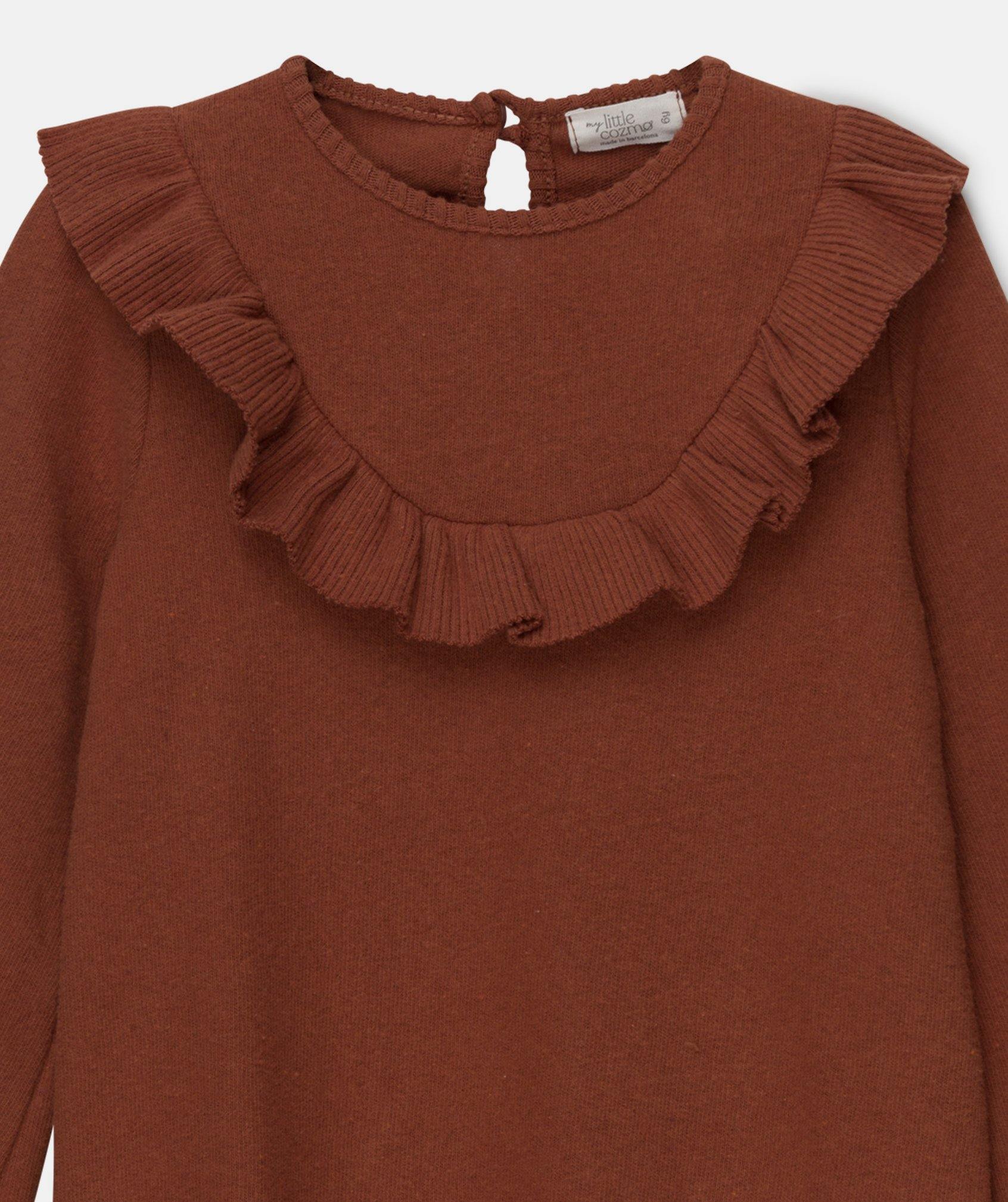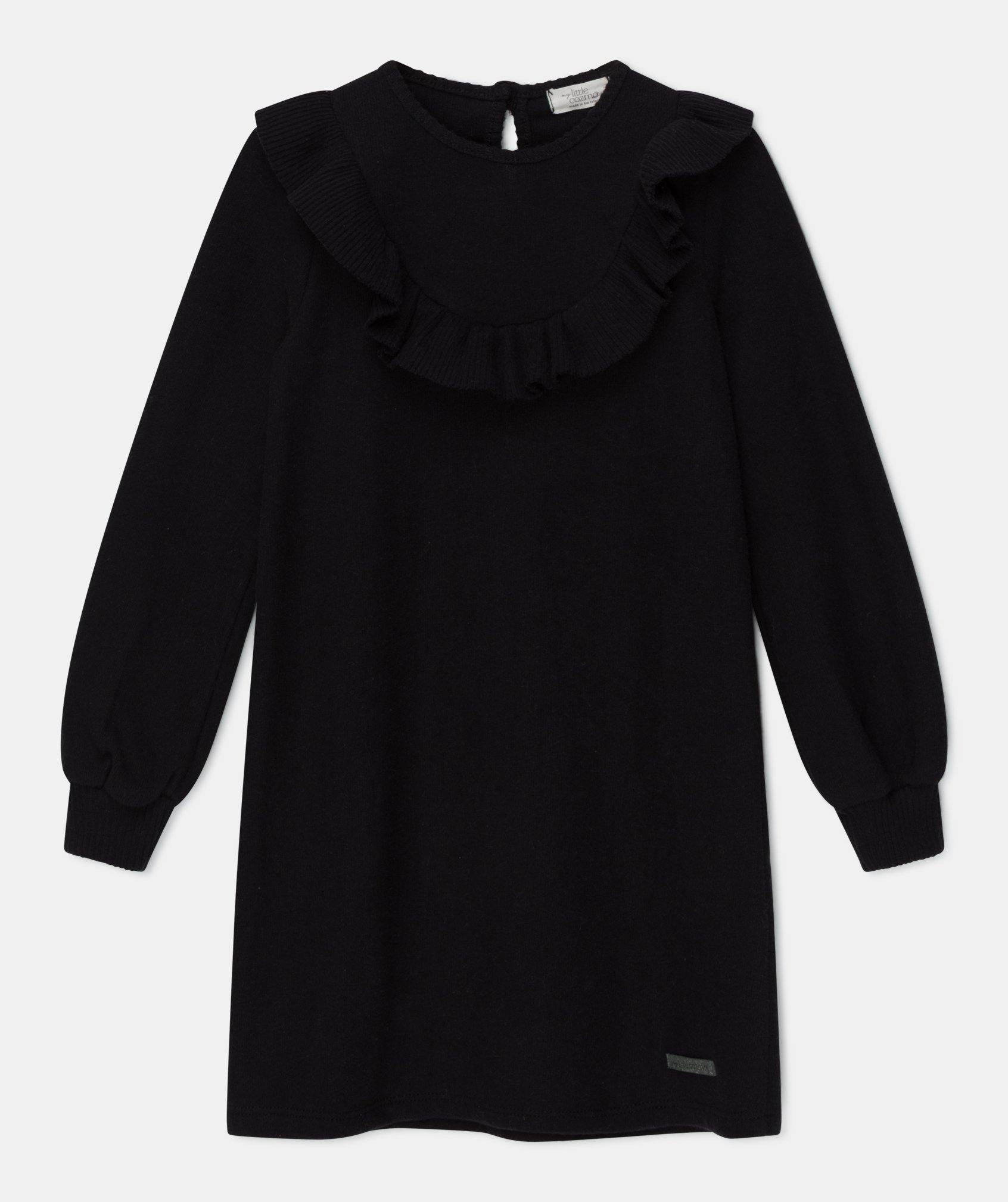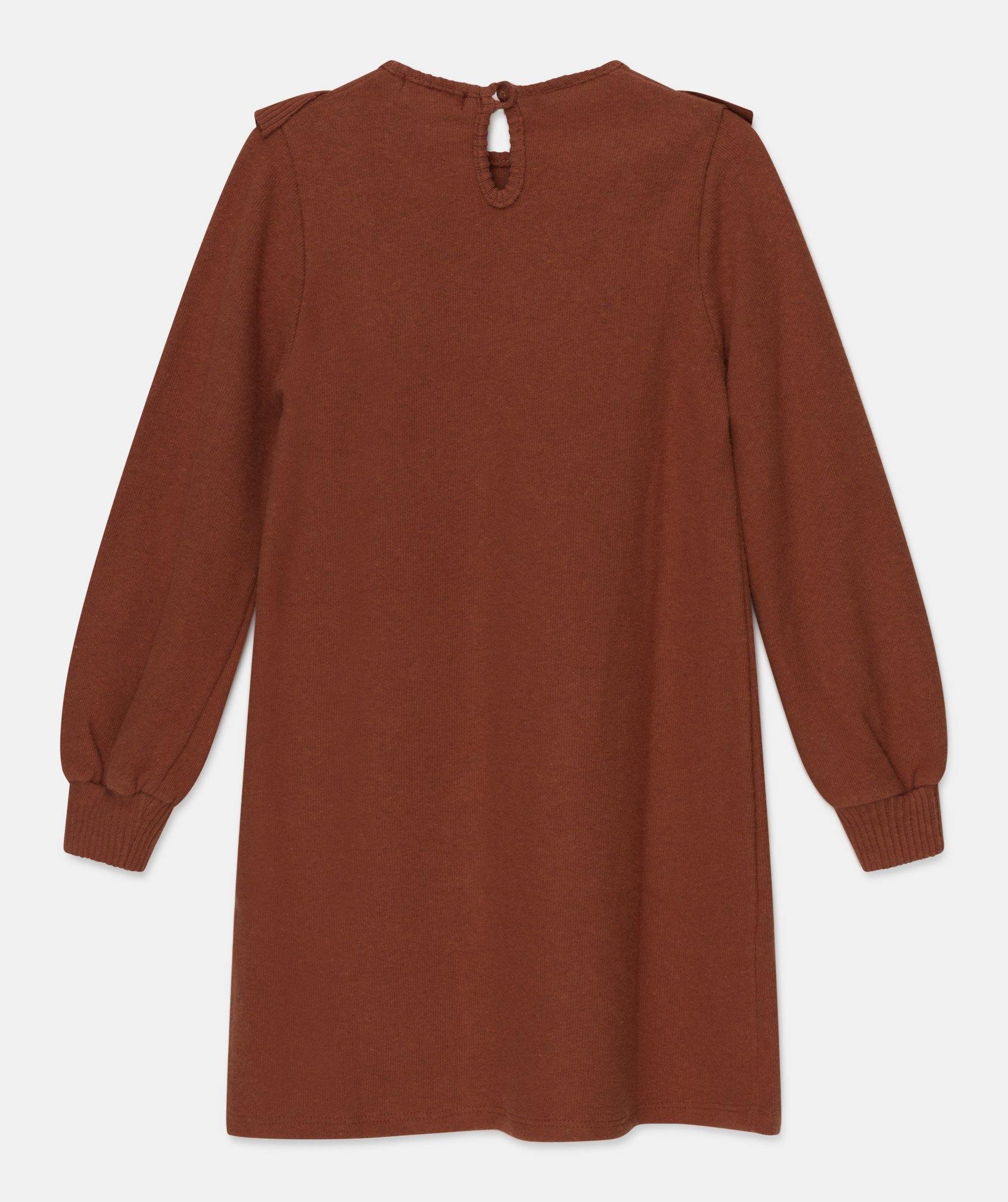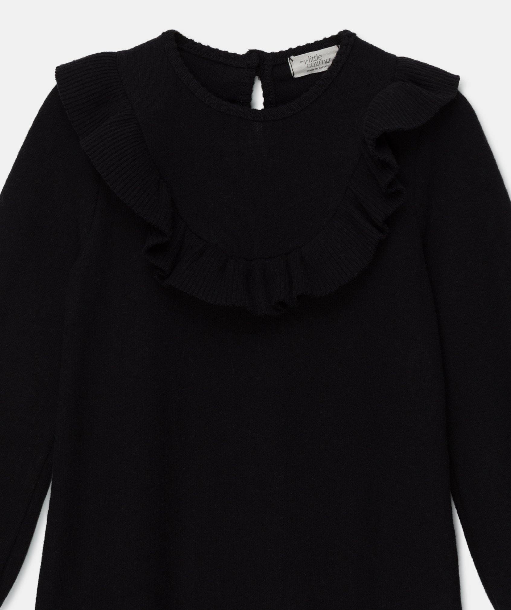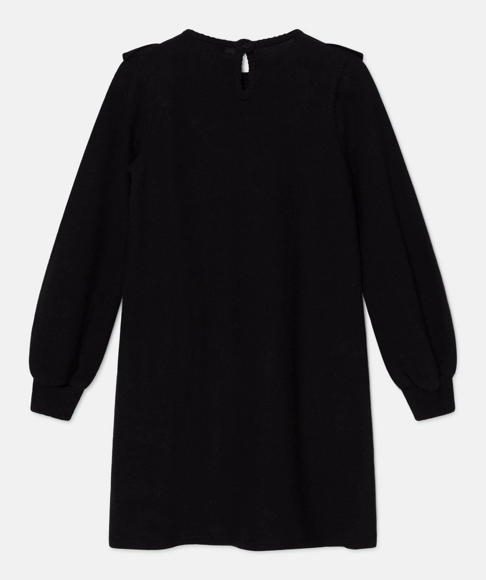 Soft knit dress with front ruffle details and long sleeves tightened at wrists.