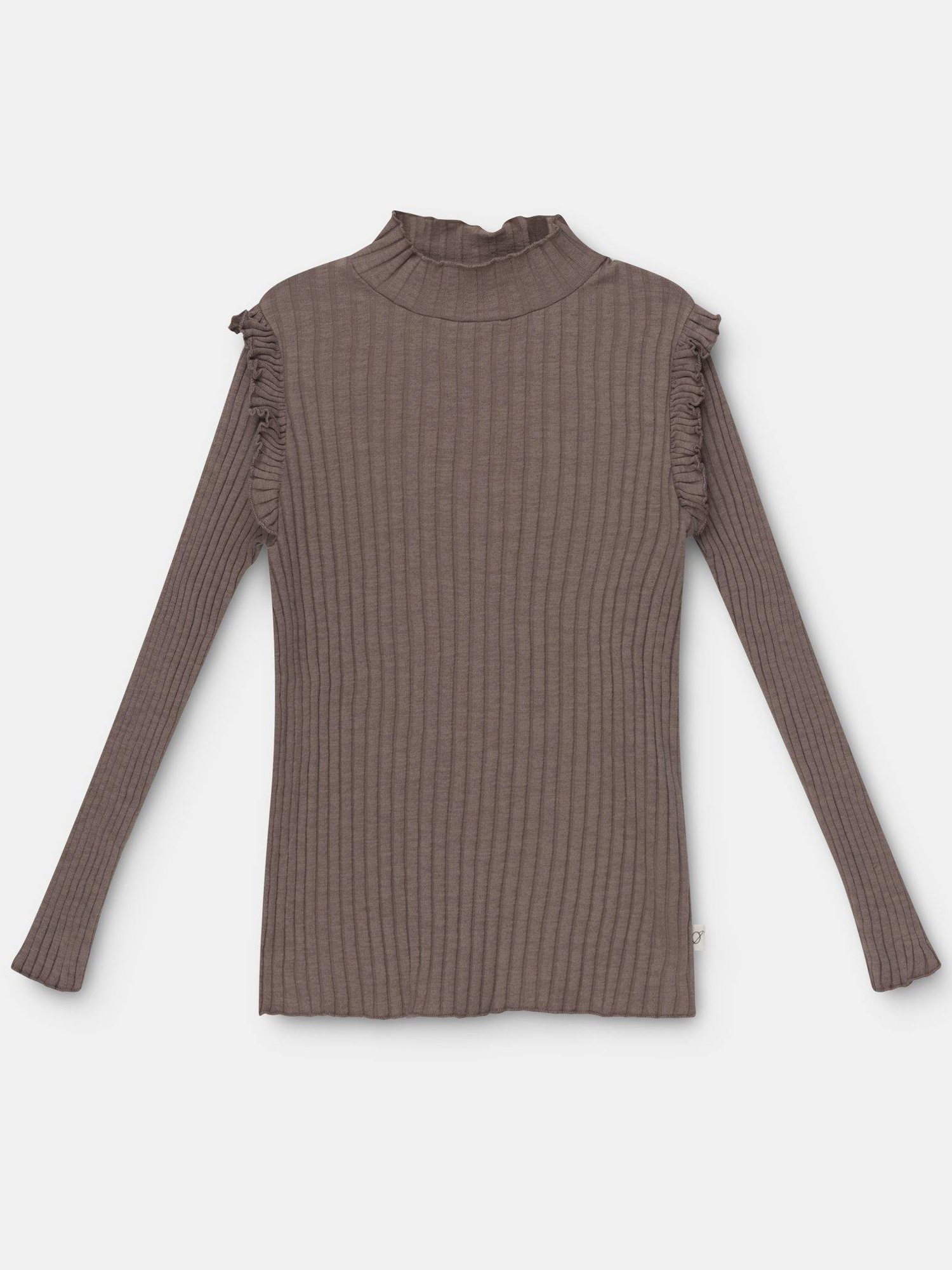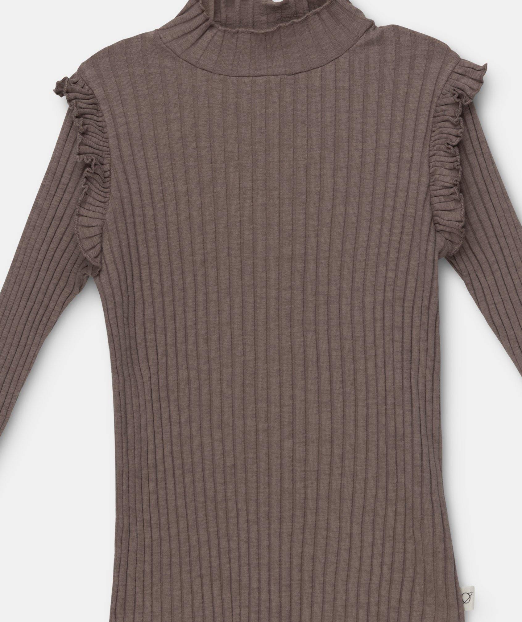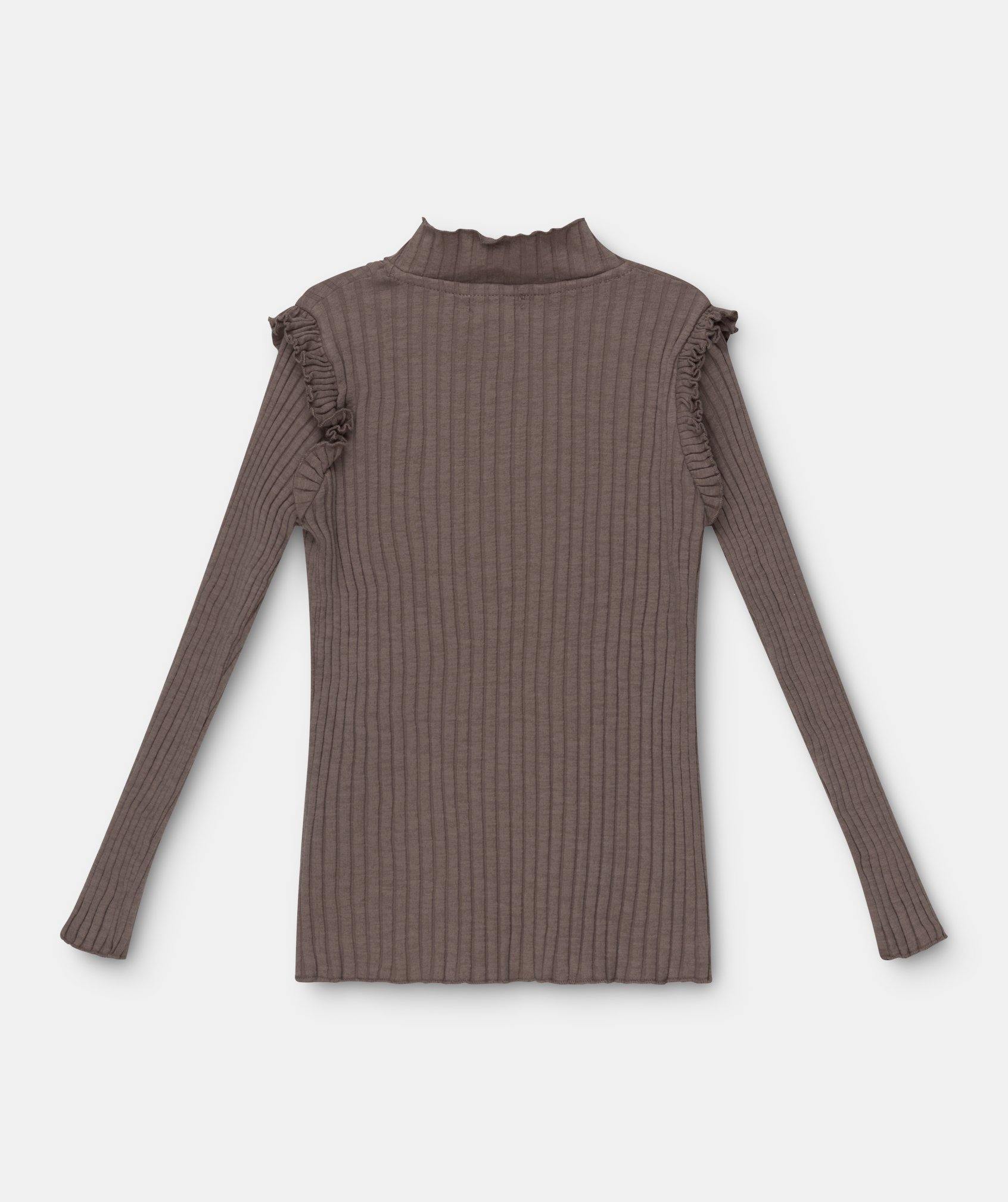 Organic girls ribbed T-shirt with a high neck and ruffle details