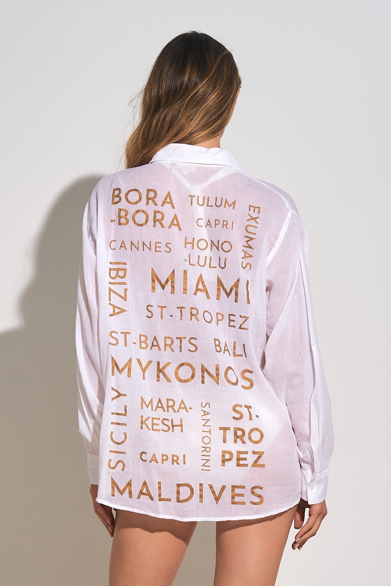 Bring vacation vibes to your wardrobe with the "Vista" Button-Down Top. This chic top showcases graphics on the back featuring everyone's favorite destinations. Elevate your casual style and let your imagination wander with Vista, making it the perfect choice for a laid-back and trendy look.