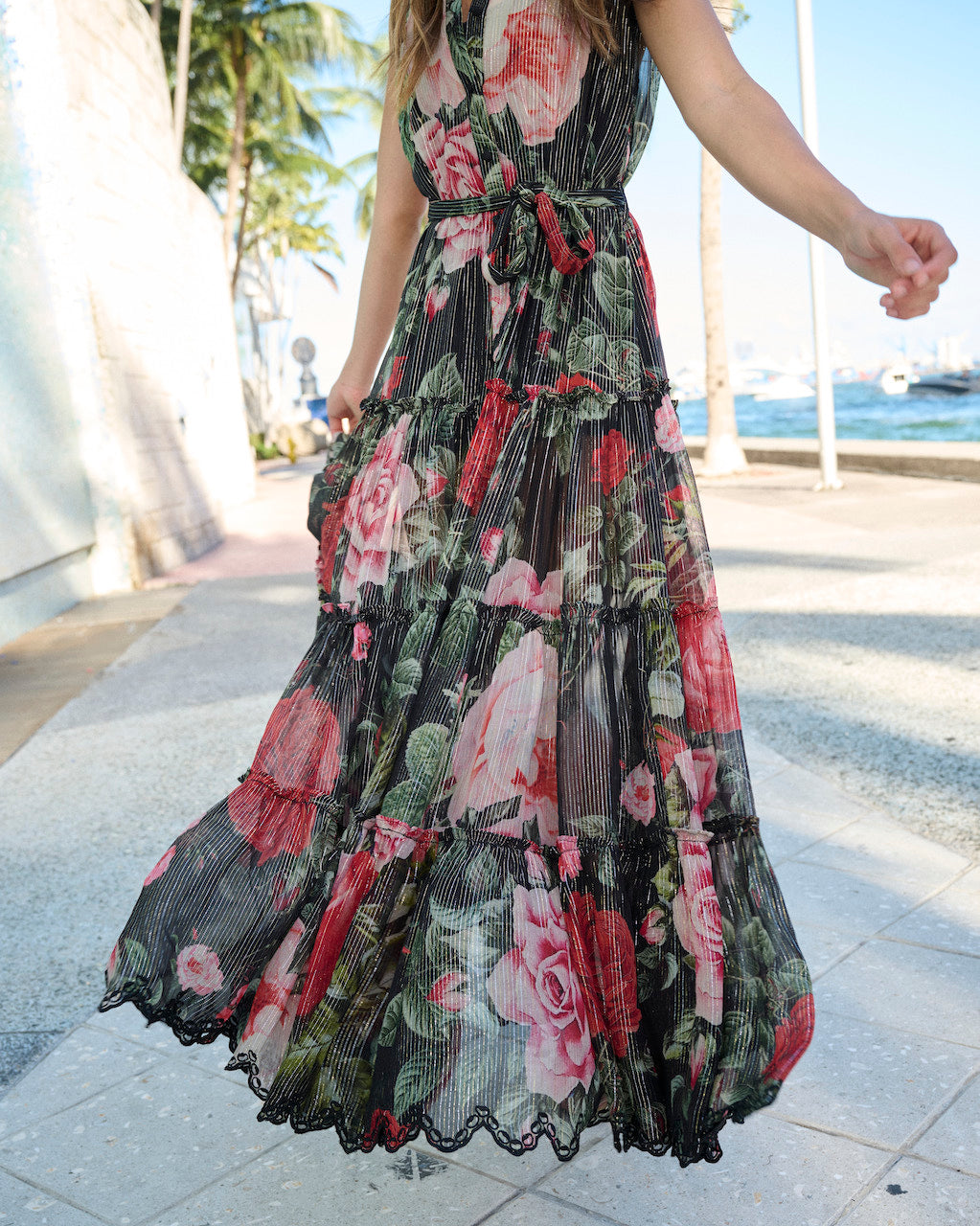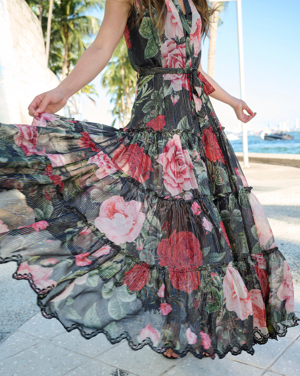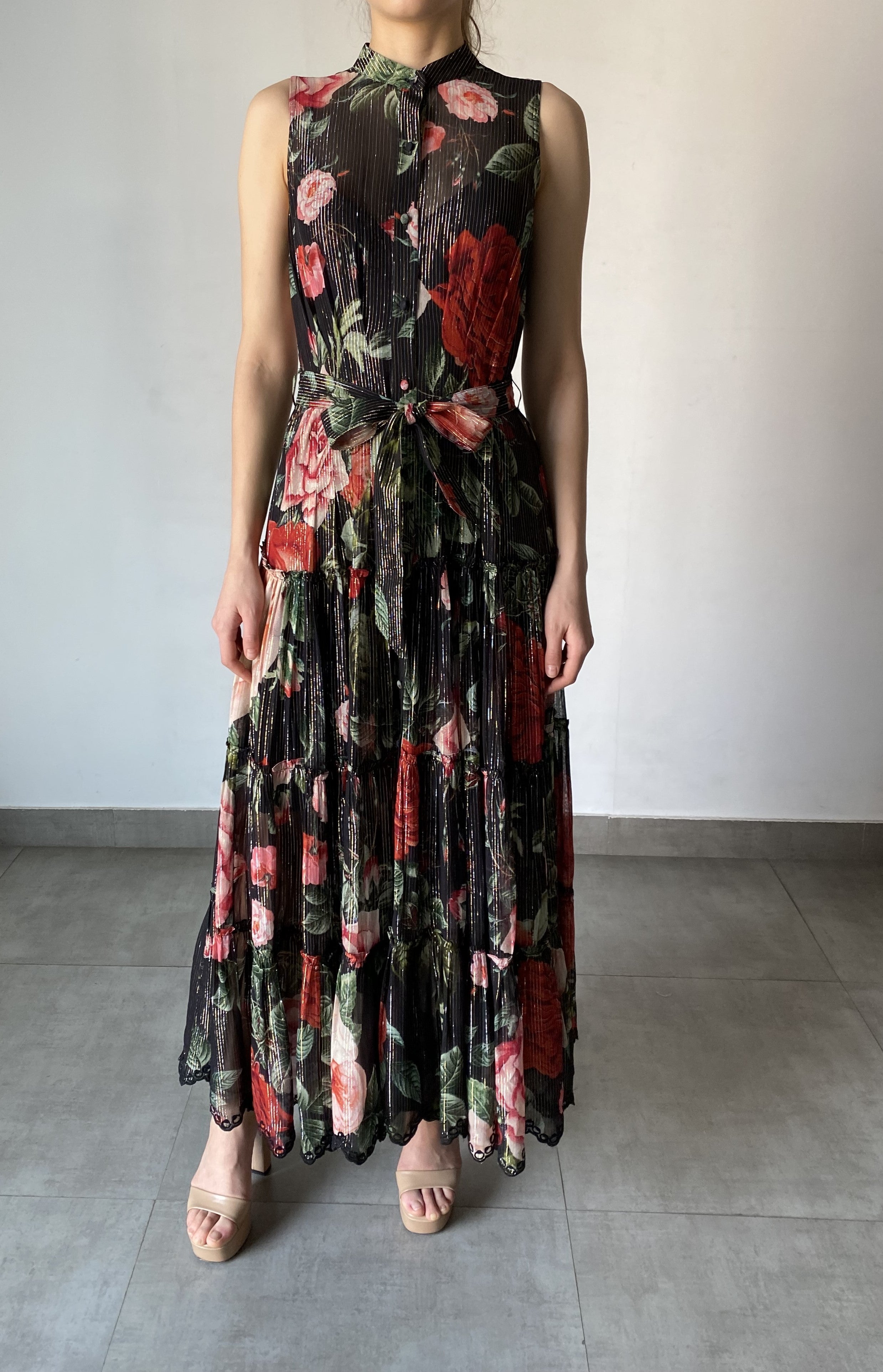 The classic allure of black meets the blooming elegance of a rose print with the Naaz Long Dress from the Fall'23 collection. A cascading tiered long dress crafted in viscose georgette and accentuated with the glittering sheen of lurex, it comes with a band collar and a tie-up waist belt. A complete head-turning style!