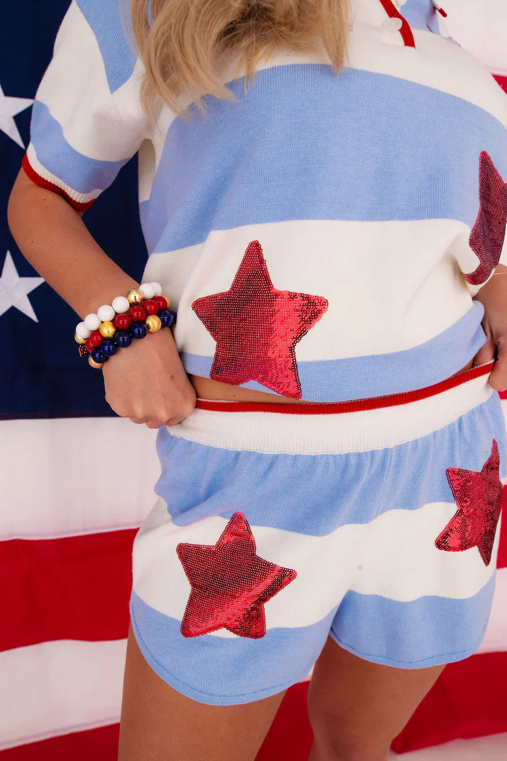 - Featuring powder blue and white stripes with sequin red stars