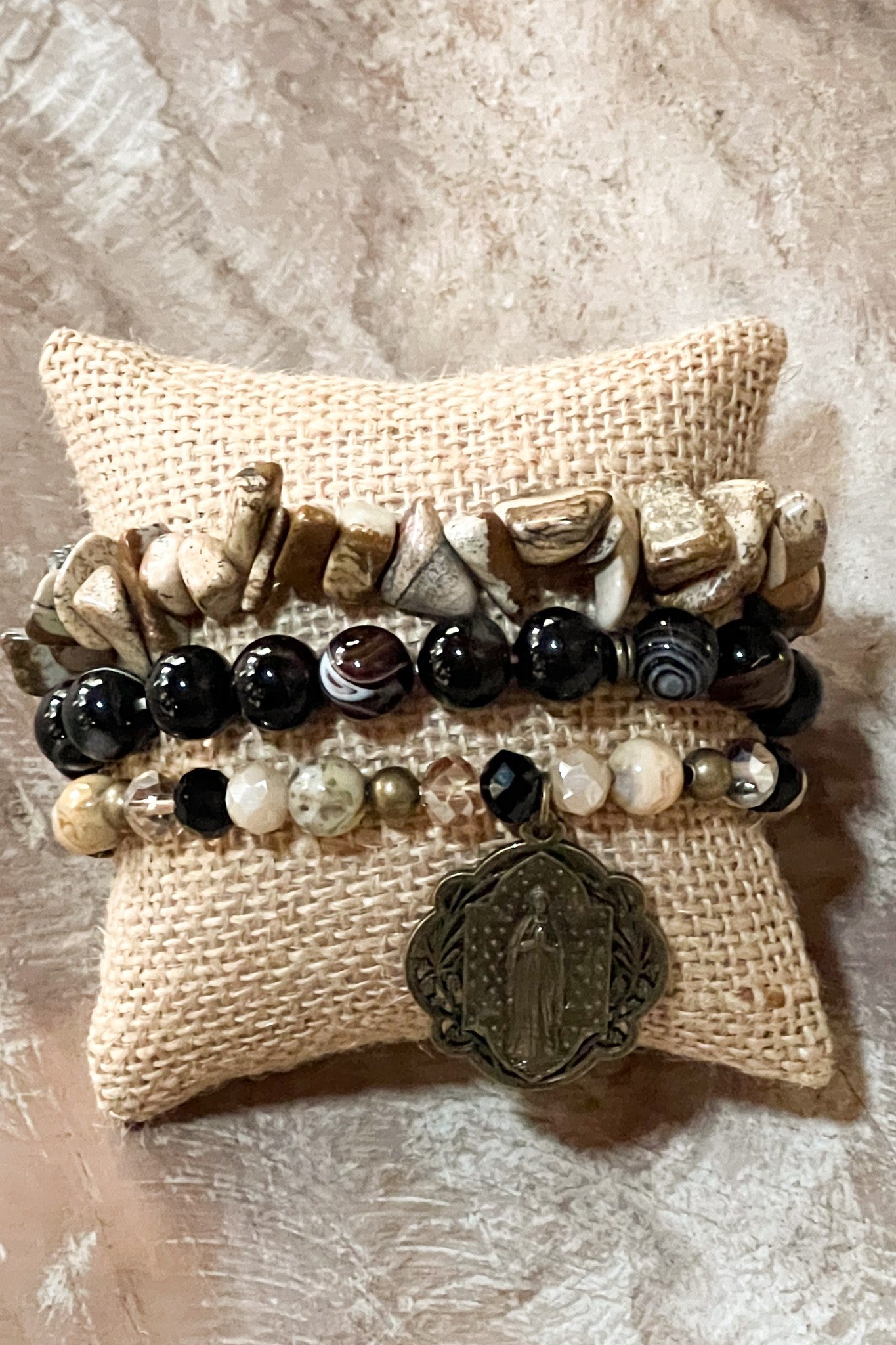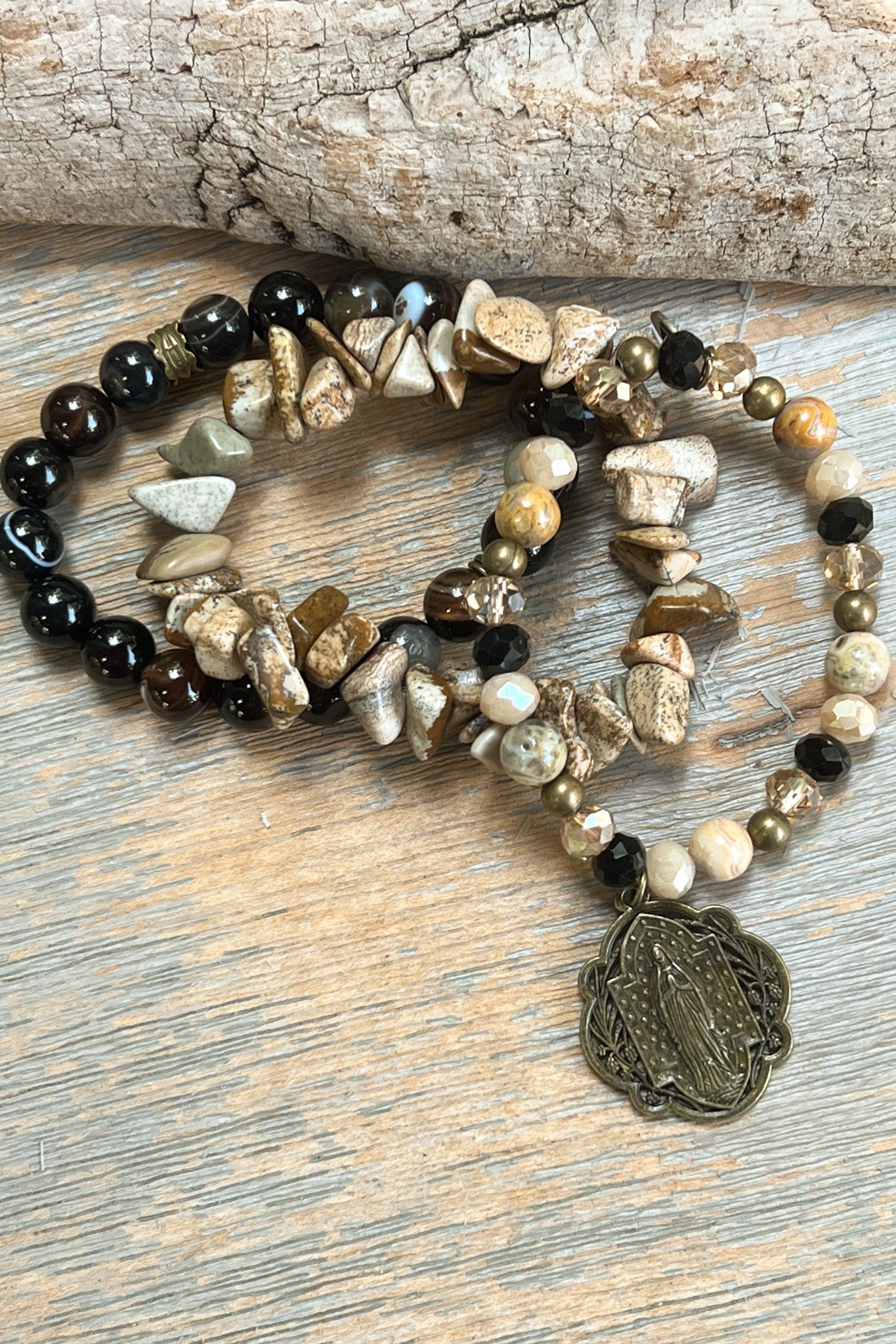 Natural Stone And Beaded Bracelet. Set of 3 elastic, natural stone and beaded bracelets. One features a bronze quatrefoil coin with beautiful detailing. Please expect some variation in color/texture due to natural material. Diameter:3". Charm: 1".