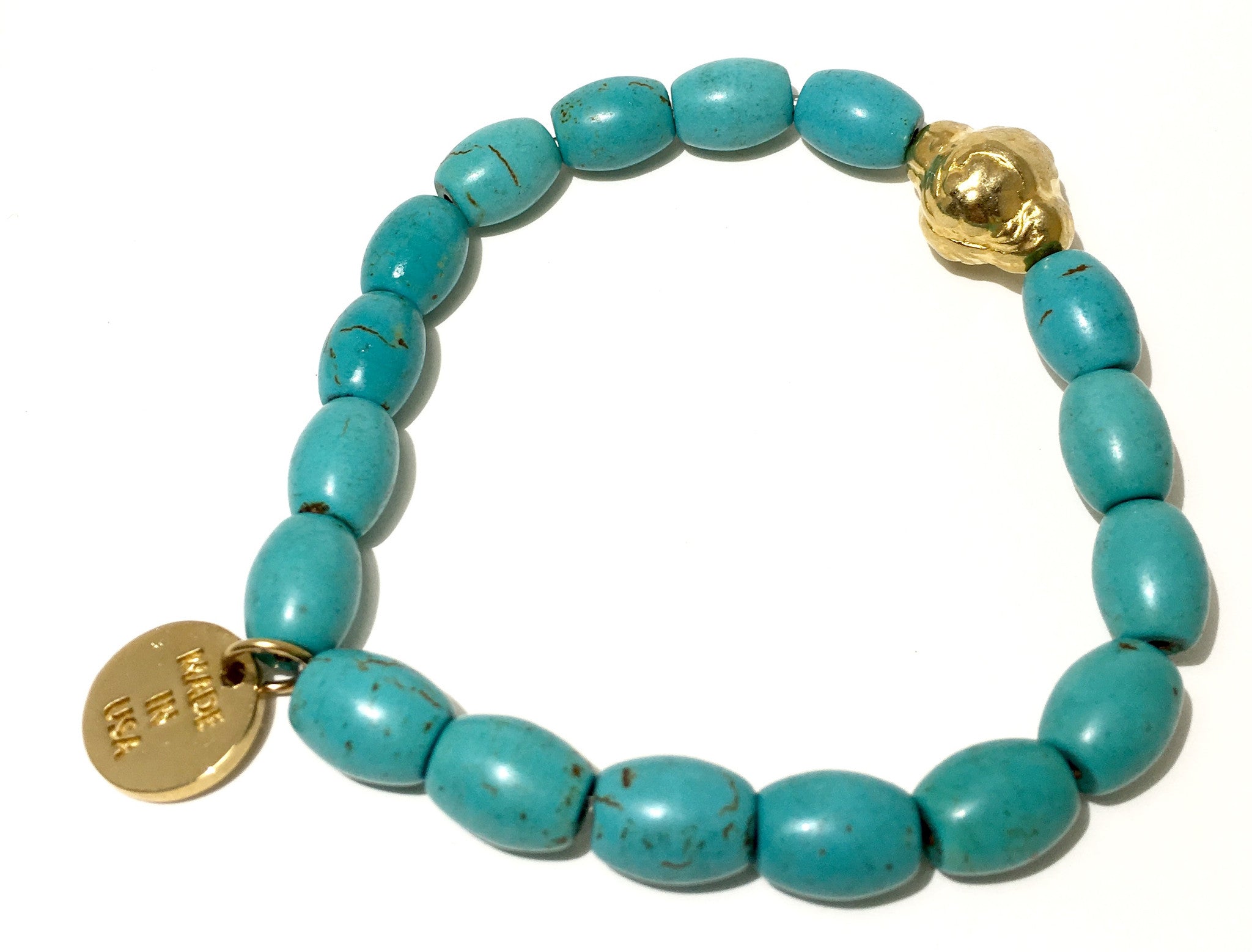The Urban Charm turquoise mantra bracelet features turquoise beads and a single gold accent bead. Turquoise represents healing. Wear this mantra bracelet as a reminder to find a healthy balance in life.
