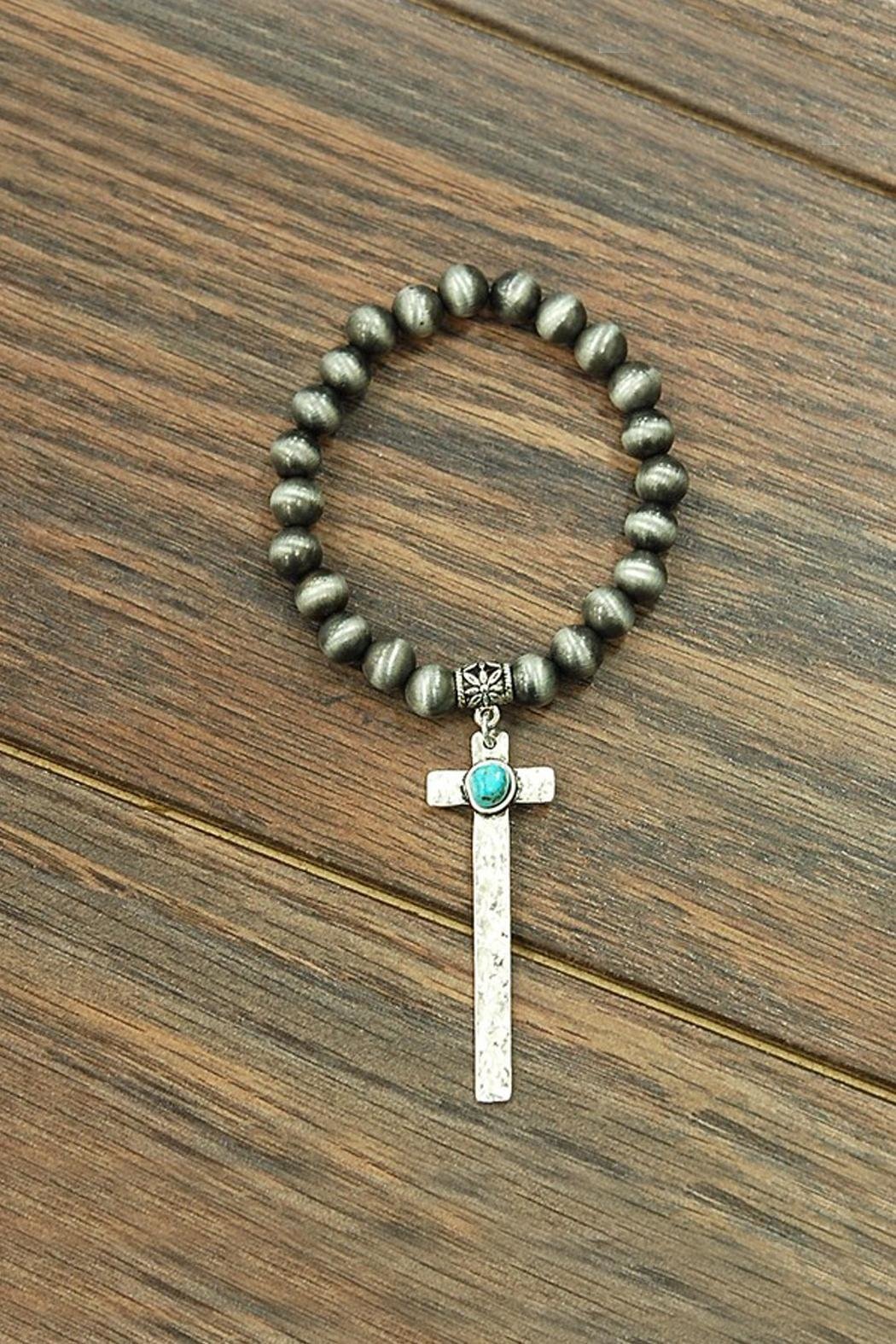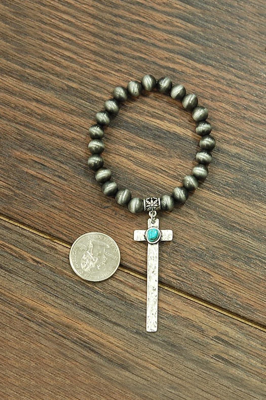 Hammered Cross Natural Turquoise, Navajo Pearl Stretch Bracelet
