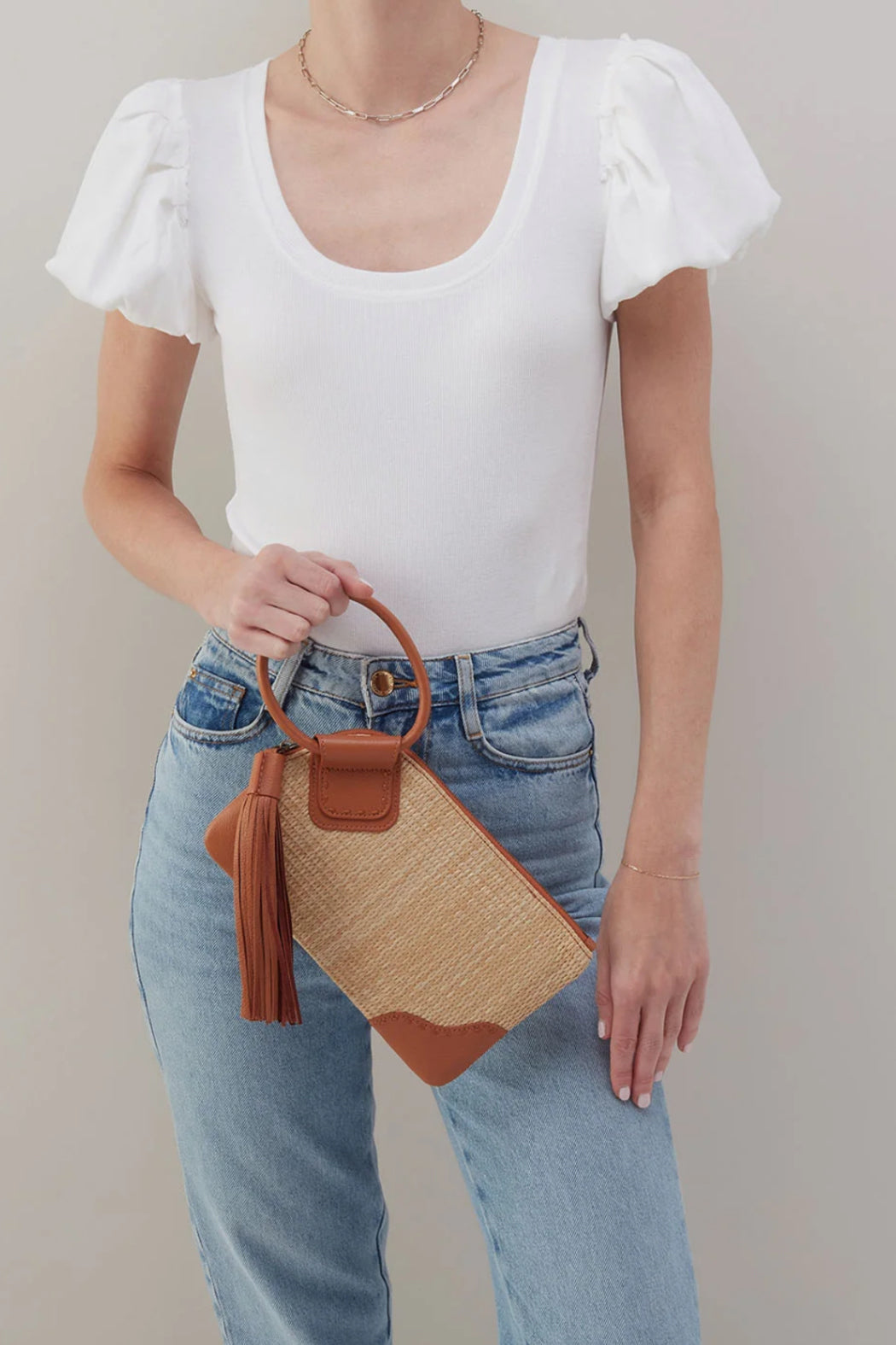 Natural straw with butterscotch trim, because sometimes natural is the way to go! Ready to grab-and-go? Sable’s convenient circular handle does it best. Small but mighty – fit your phone, keys, and more. Zipper closure to keep what’s yours, yours.