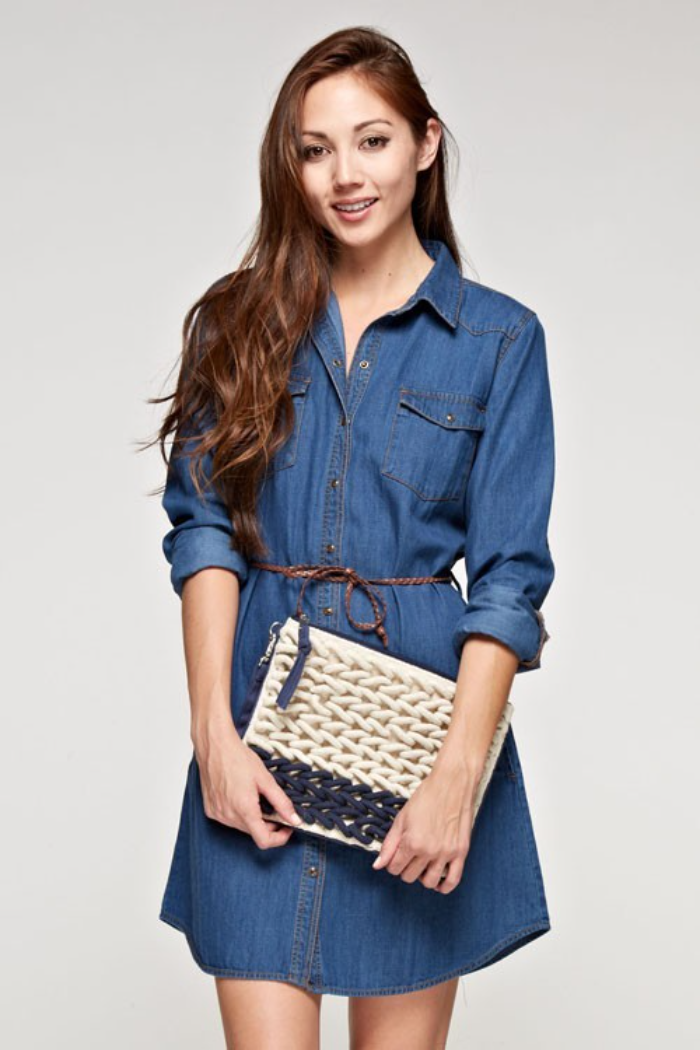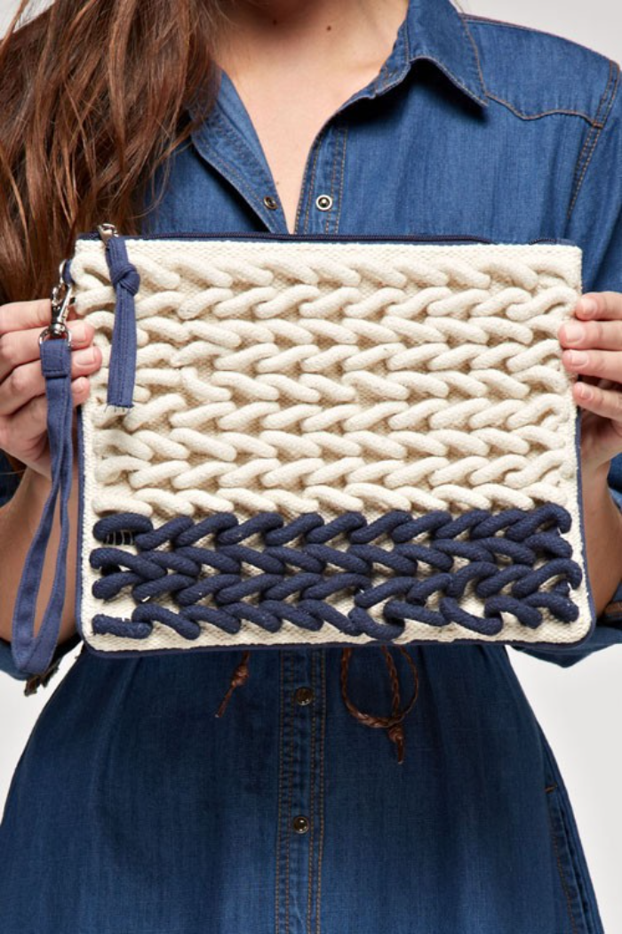 Contrast heavy yarned knitted clutch with zipper pull.