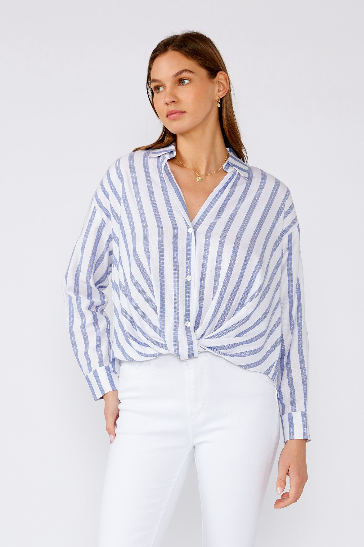 Nautical striped blouse with metallic details and a twist front. Features a collared neckline, long sleeve, button front, button cuff closure, and a high low hem. Fabric Contents 100% RAYON.