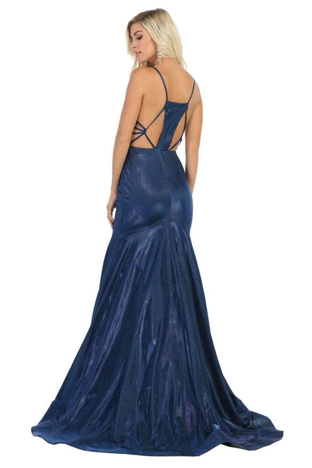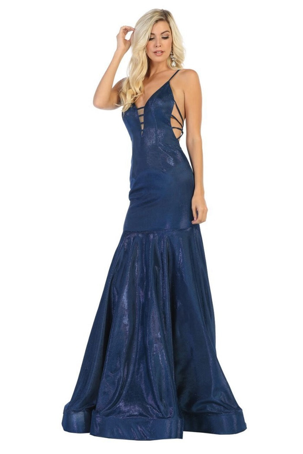 This dress features a beautiful metallic fabric, flattering fit & flare figure, low v-neckline and strappy open back, and back zipper closure.