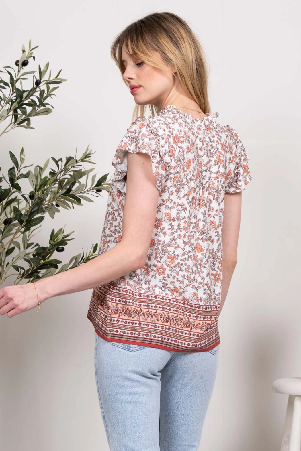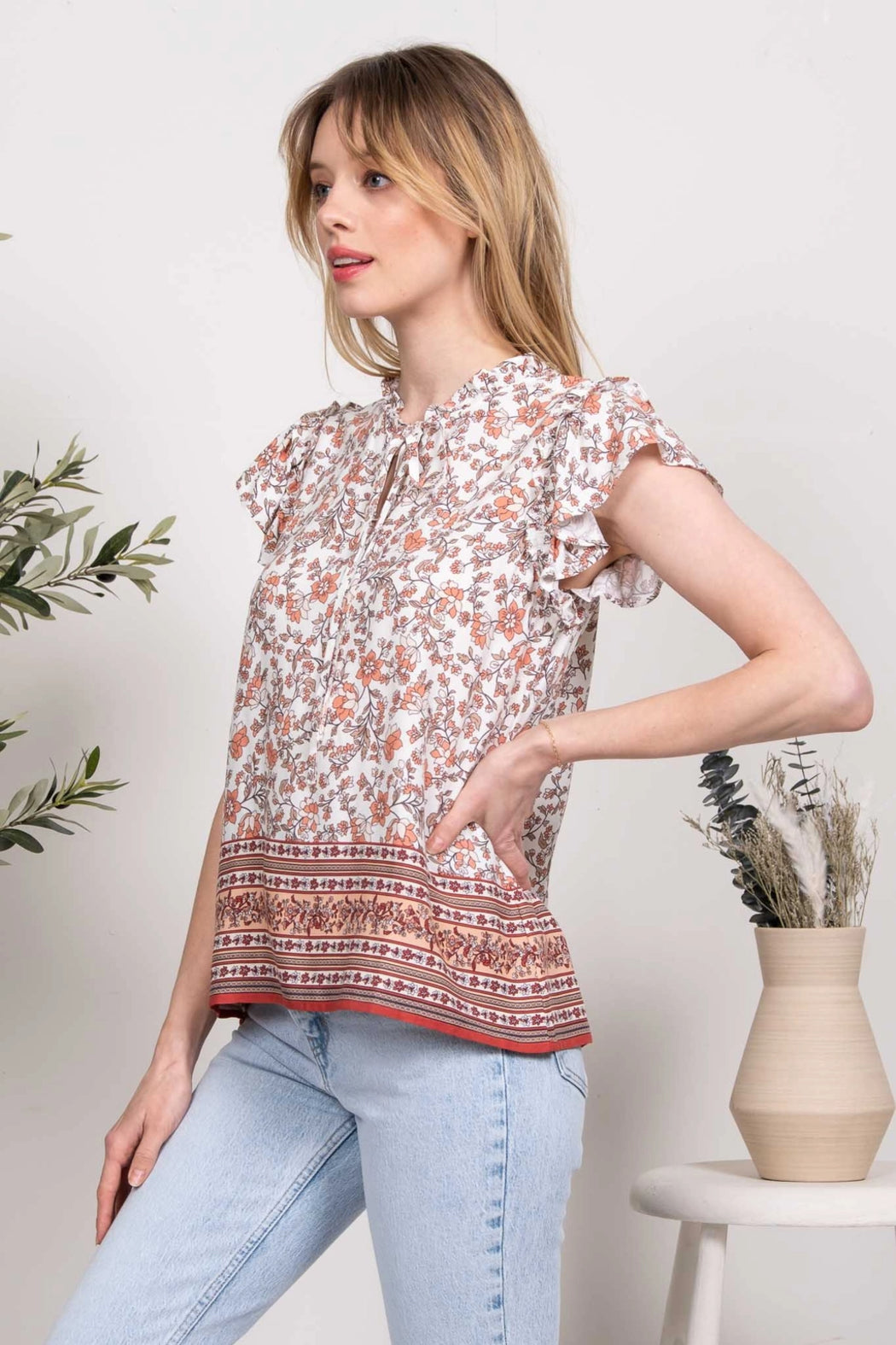 Bring to your wardrobe a delicate touch and feel-good energy to any day with our Neck Tie Floral Ruffles Top! Featuring a charming floral design throughout in salmon color with border print hemline in red color, stylish ruffled accents along the neckline and short flutter sleeves, this top exudes elegance and versatility with the front self neck tie nicely split in a round neckline, material has some stretch, unlined. Embrace a look that seamlessly transitions from casual to chic effortlessly. Add a touch of floral flair to your outfit and make a fashion statement with this must-have piece! Model wears size Small L: 25" 1/2 B: 38" W: 42" H: 43"