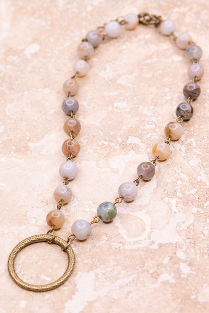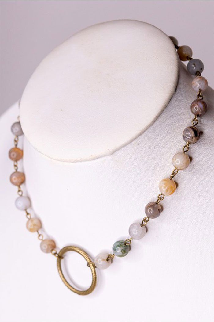Necklace Shay Bamboo. This choker style necklace features beautiful, natural stone beads and a bronze ring pendant. The lobster claw allows you to adjust the length. There is a 2" extender. Length: 8" (closed on shortest link)