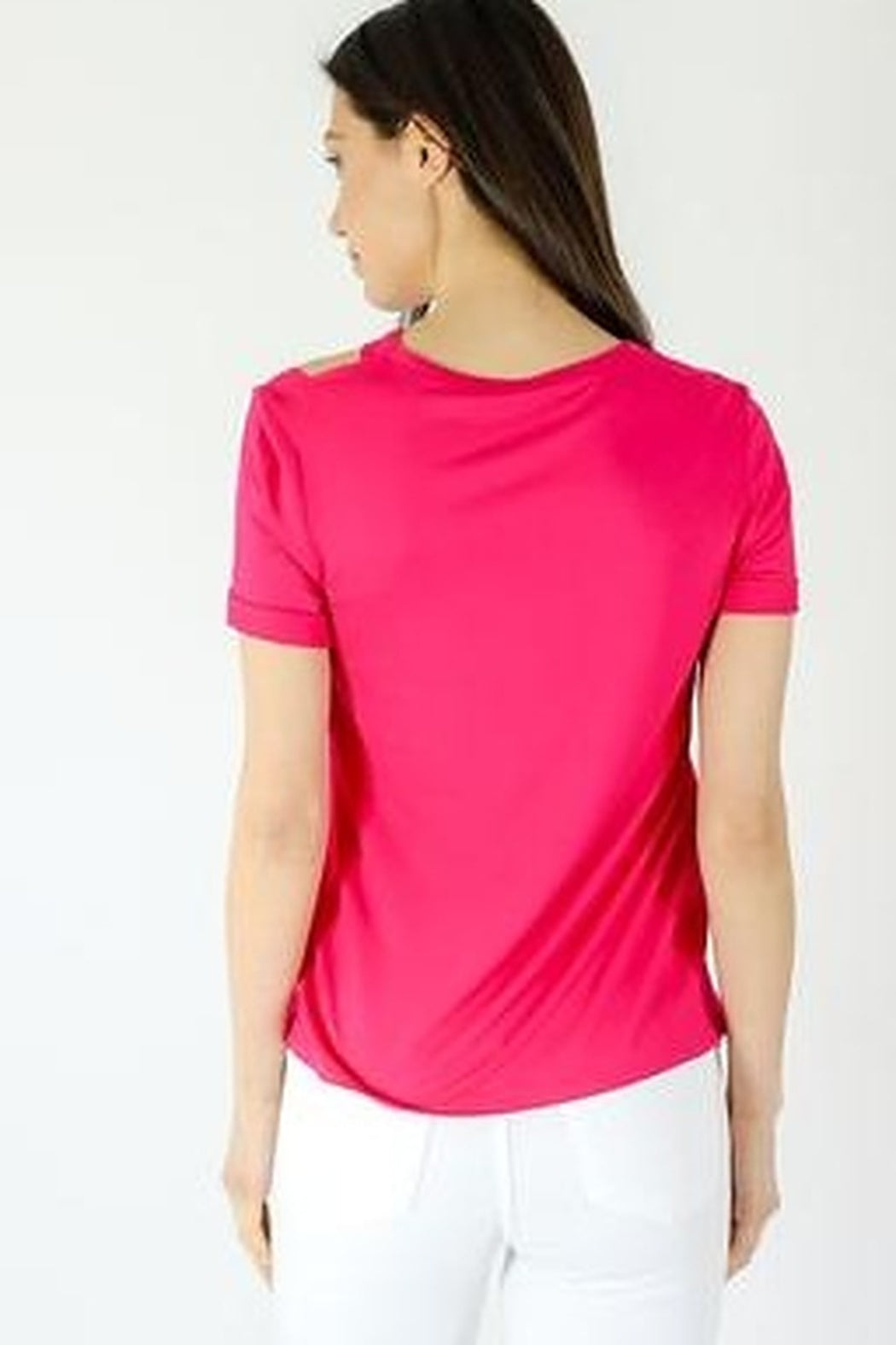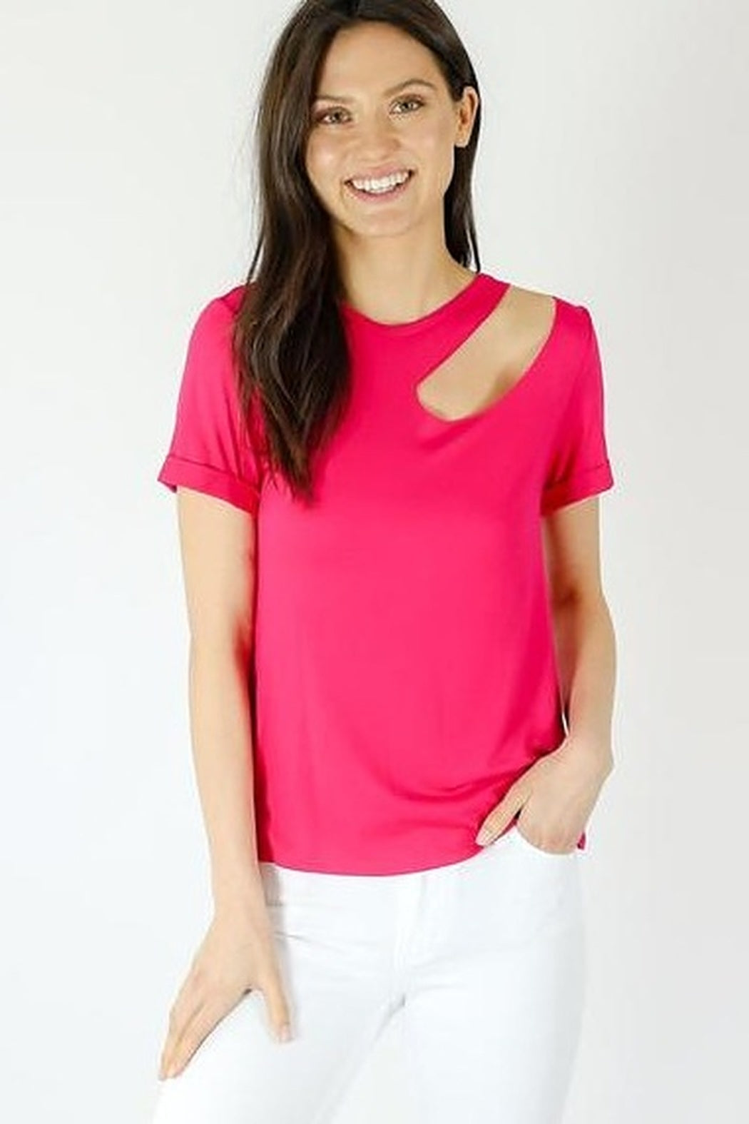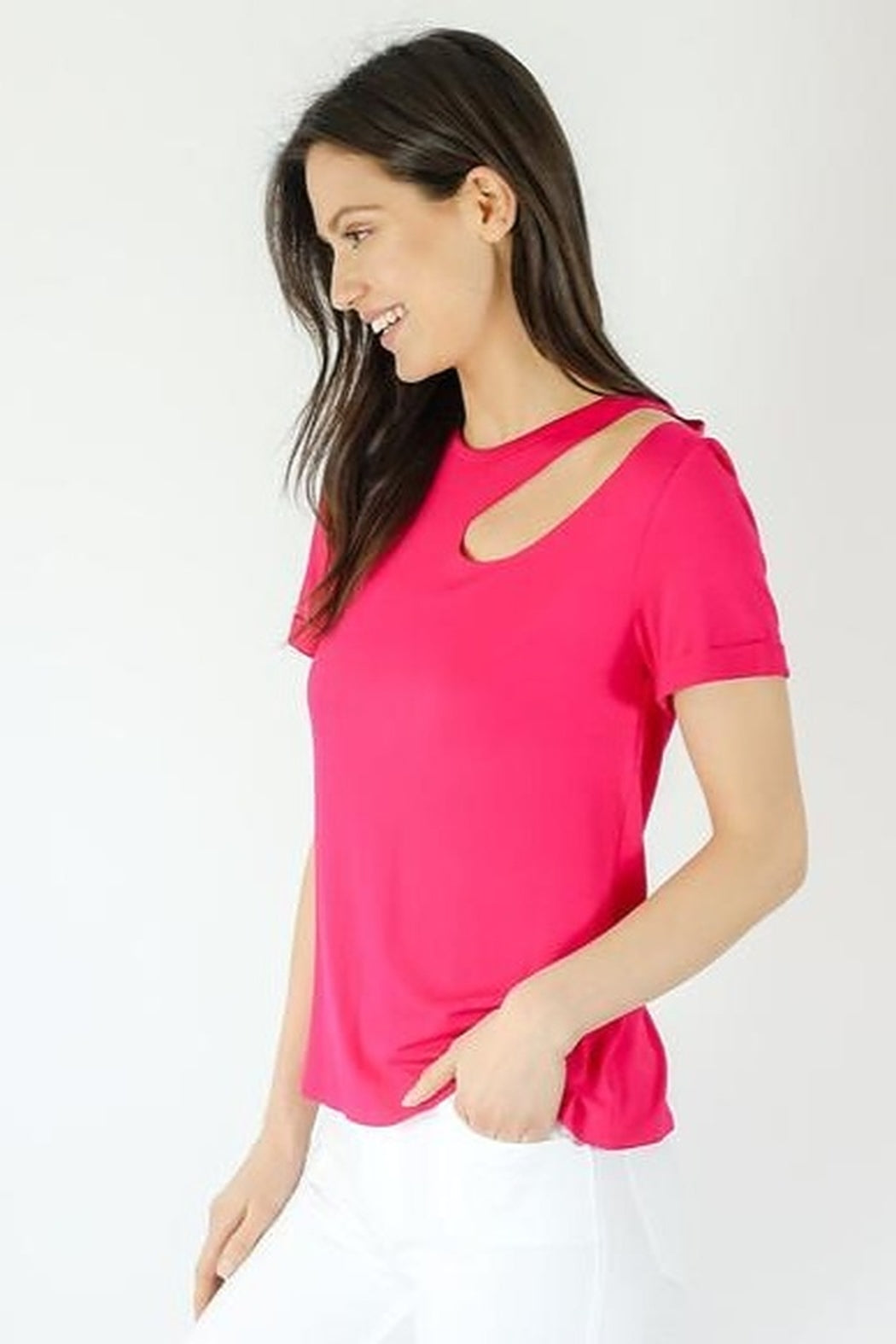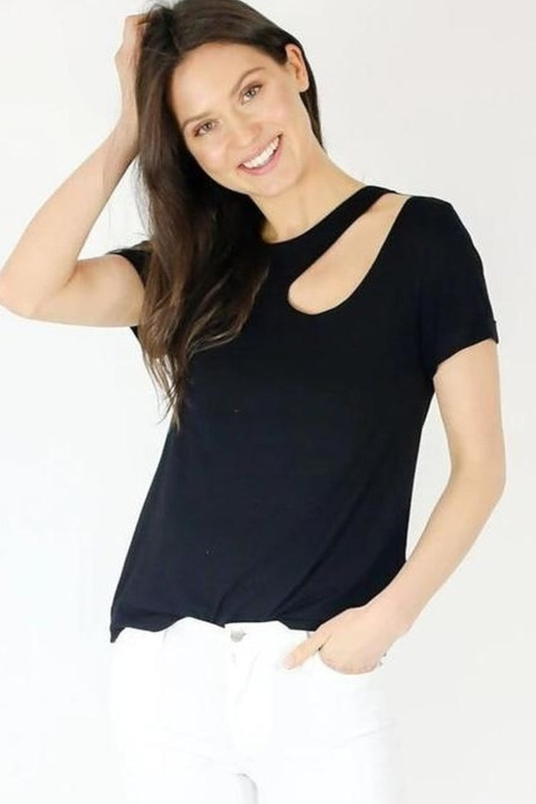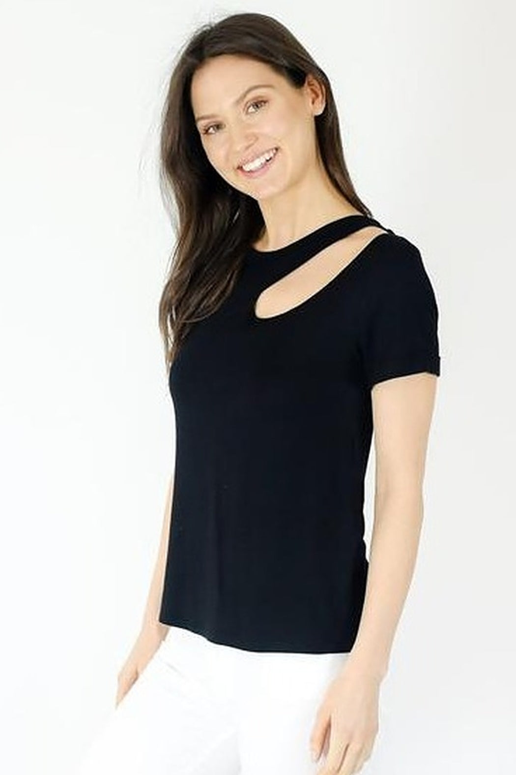 This short sleeve tee shirt has cutout detail at neckline and cuffed sleeves. It can also be worn knotted up.