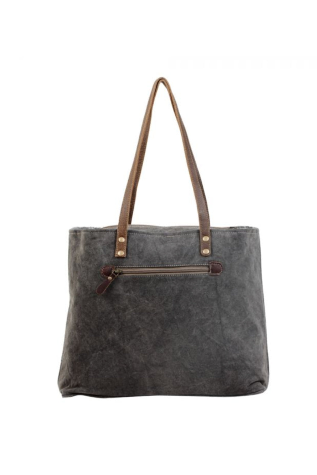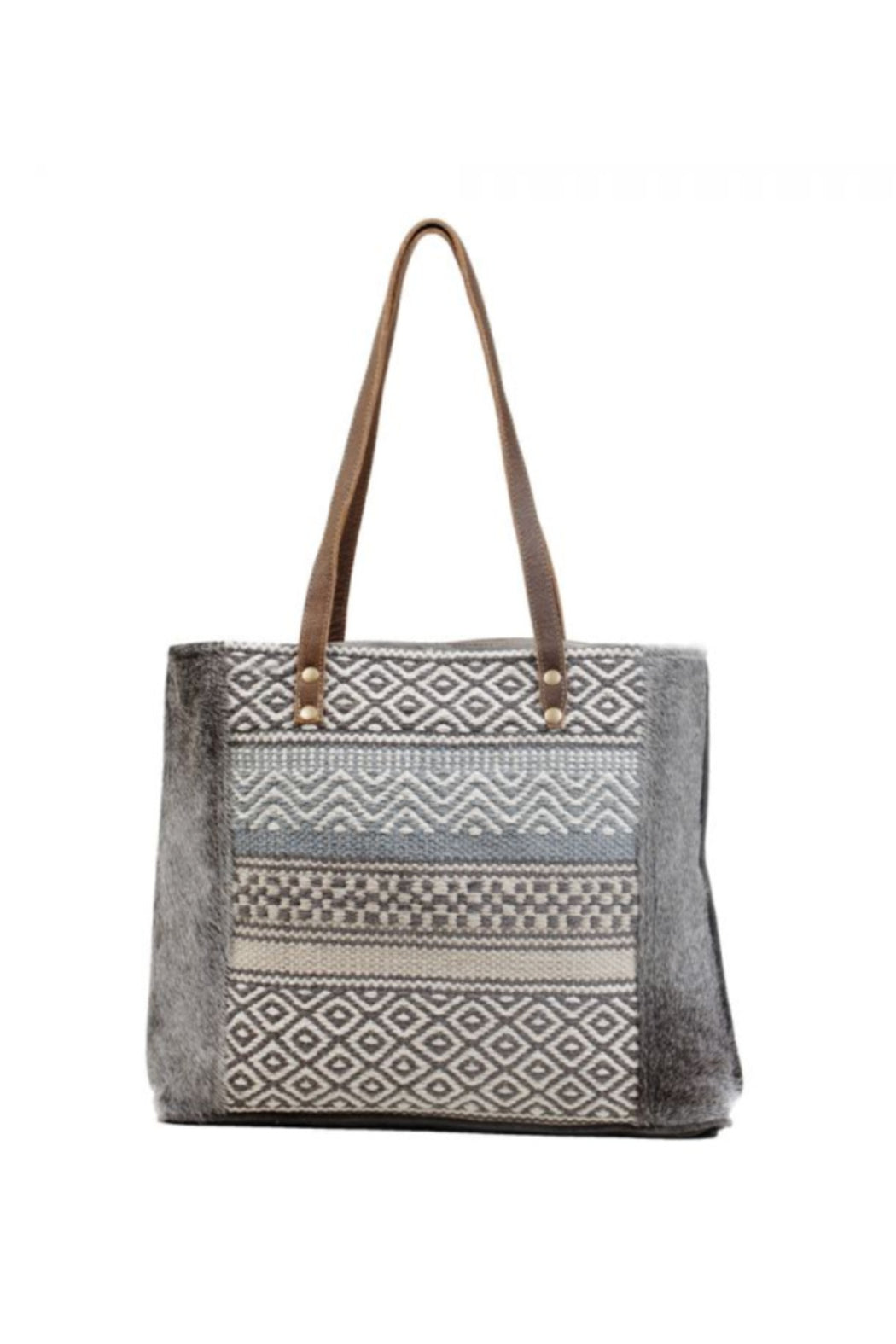 Beautiful combination of cowhide, tapestry, leather and canvas. Perfect size for travel or anytime. One outside pocket and three interior pockets. Cowhide color may vary on each bag. Item Width 18". Item Depth 4". Item Height 13". Handle: 11.5".
