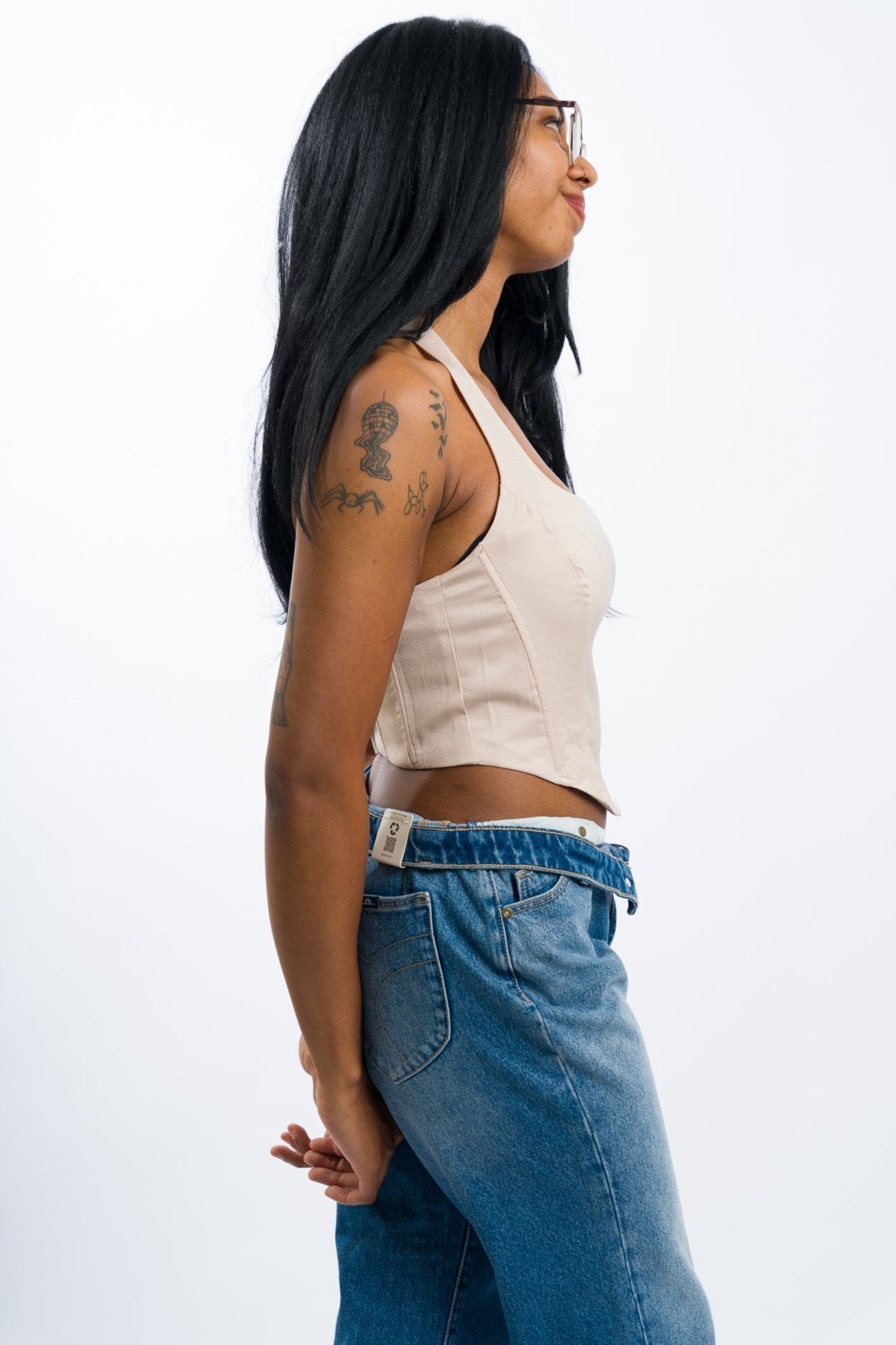 Satin halter neck corset top with princess seams for shaping. Unlined.