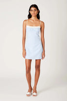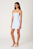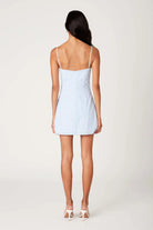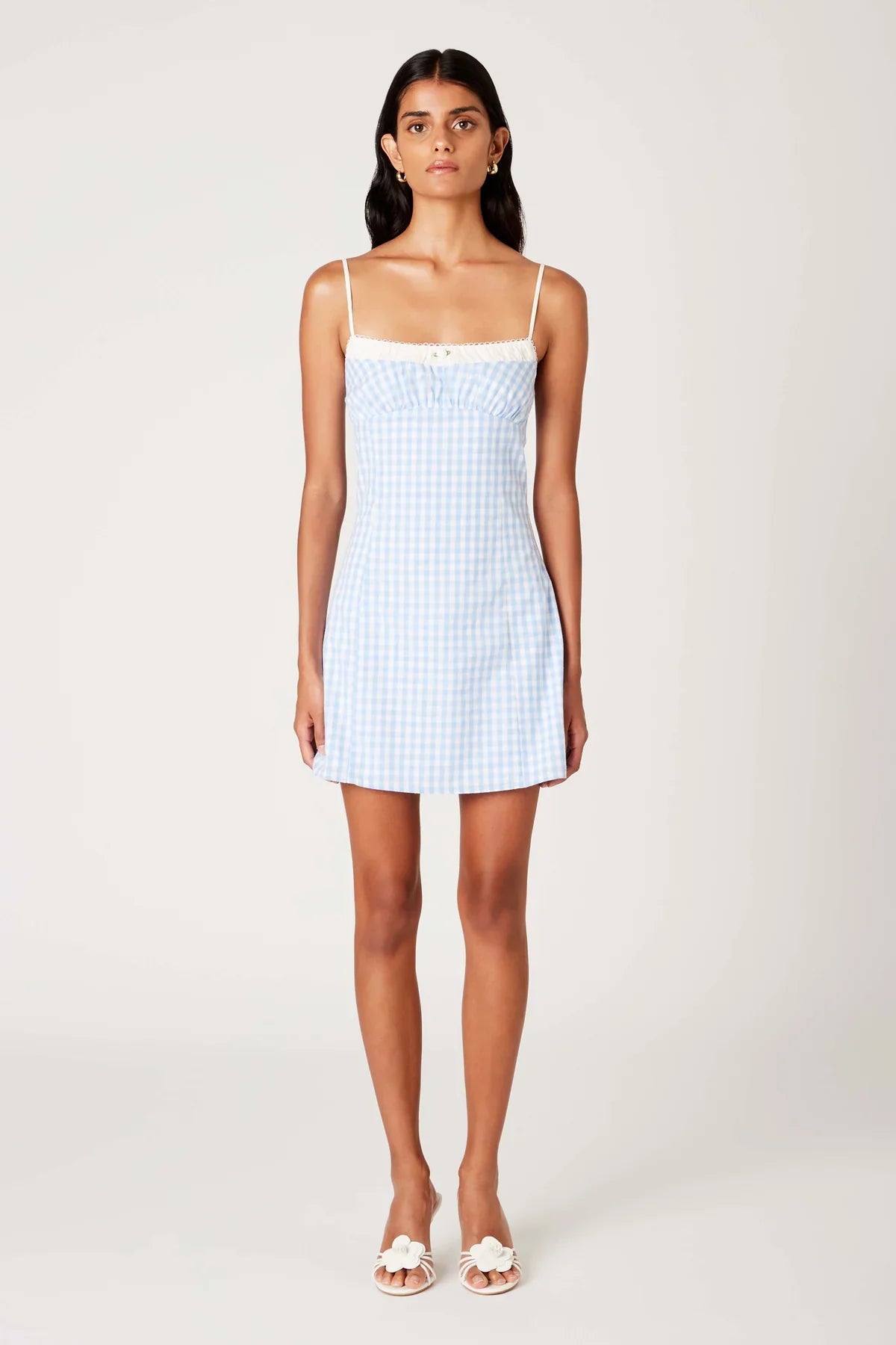 The NIA | Serrano Dress features a mini dress design with a charming checker pattern in baby blue.