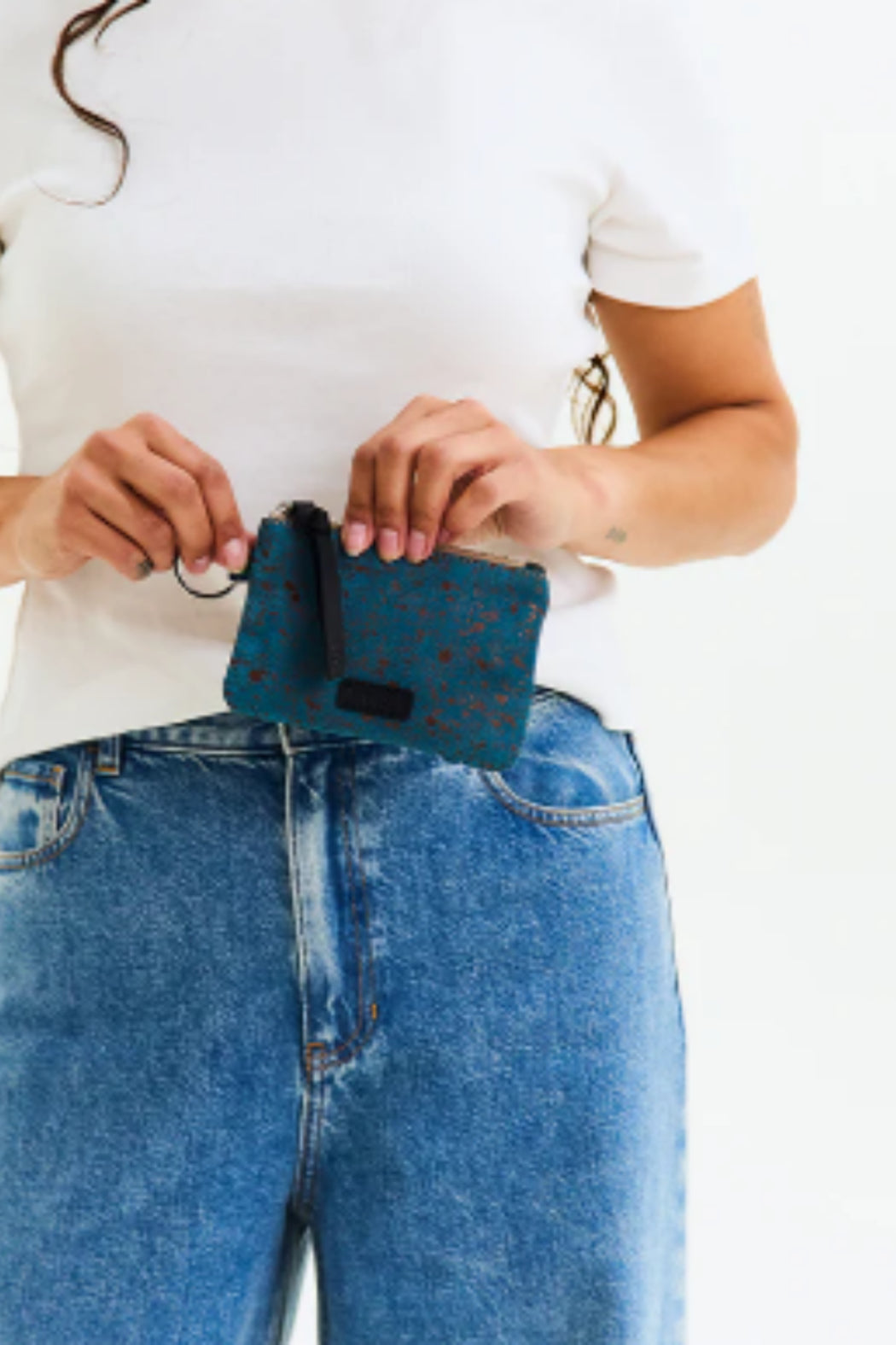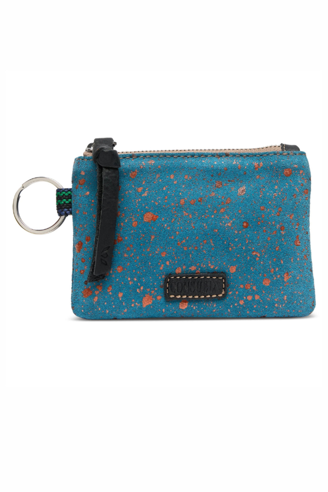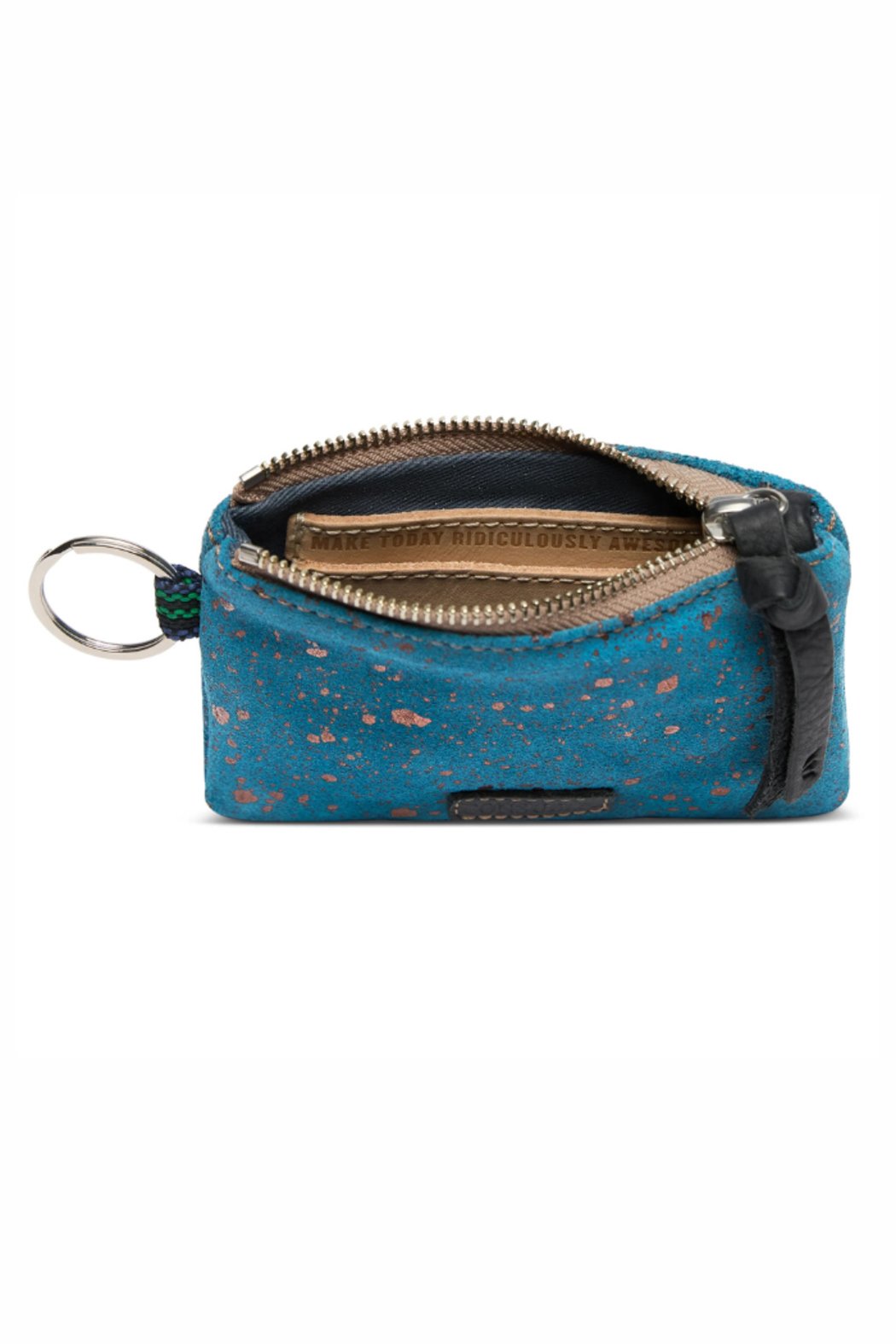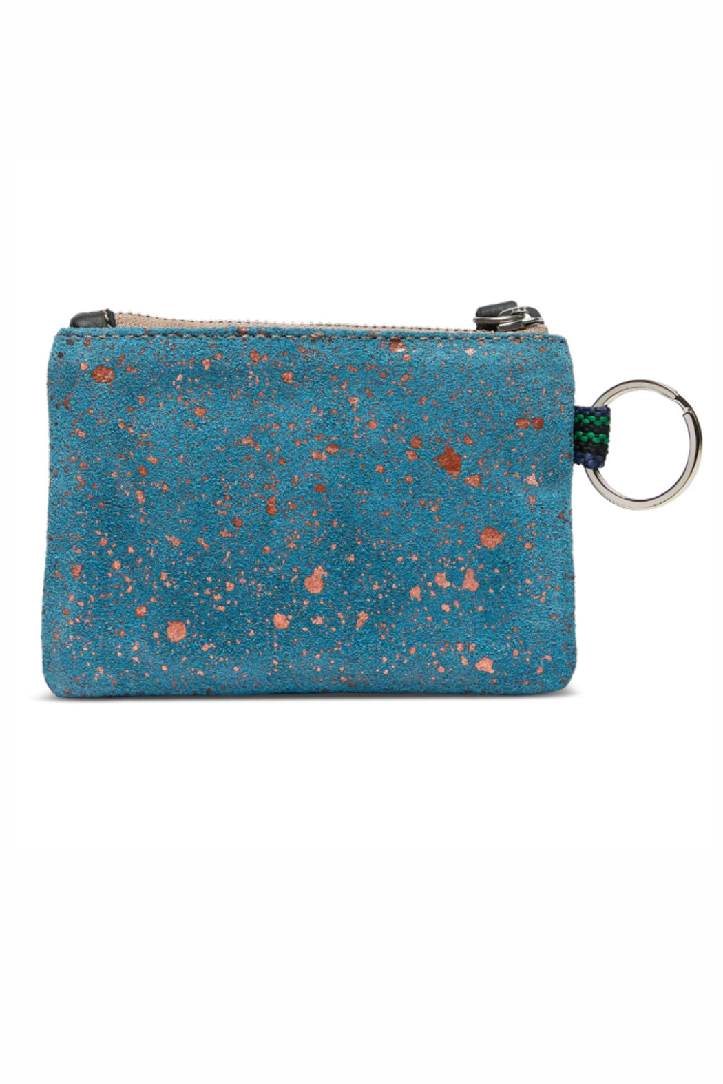 The Pouch is an easy, all-in-one bag to keep your cards and cash organized and on hand. An attached metal keyring takes this colorful pouch wallet from your bag to keys with ease. Details & Sizing: - Slate blue suede with bronze metallic flecks exterior - Black leather zipper pull and logo accent - Interior credit card slot - Attached keyring - 5 ¾” (W) x 3 ¾” (H) x ½” (D) - Made in Mexico