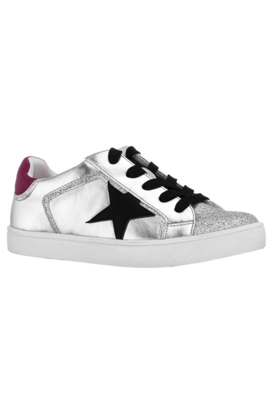 eel like a star in this low-top sneaker with decorative star applique. Metallic and smooth uppers are accented with glitter to make this style pop. A functional inside zipper for easy-on wear and cushioned memory foam insole make this a stellar choice for everyday!