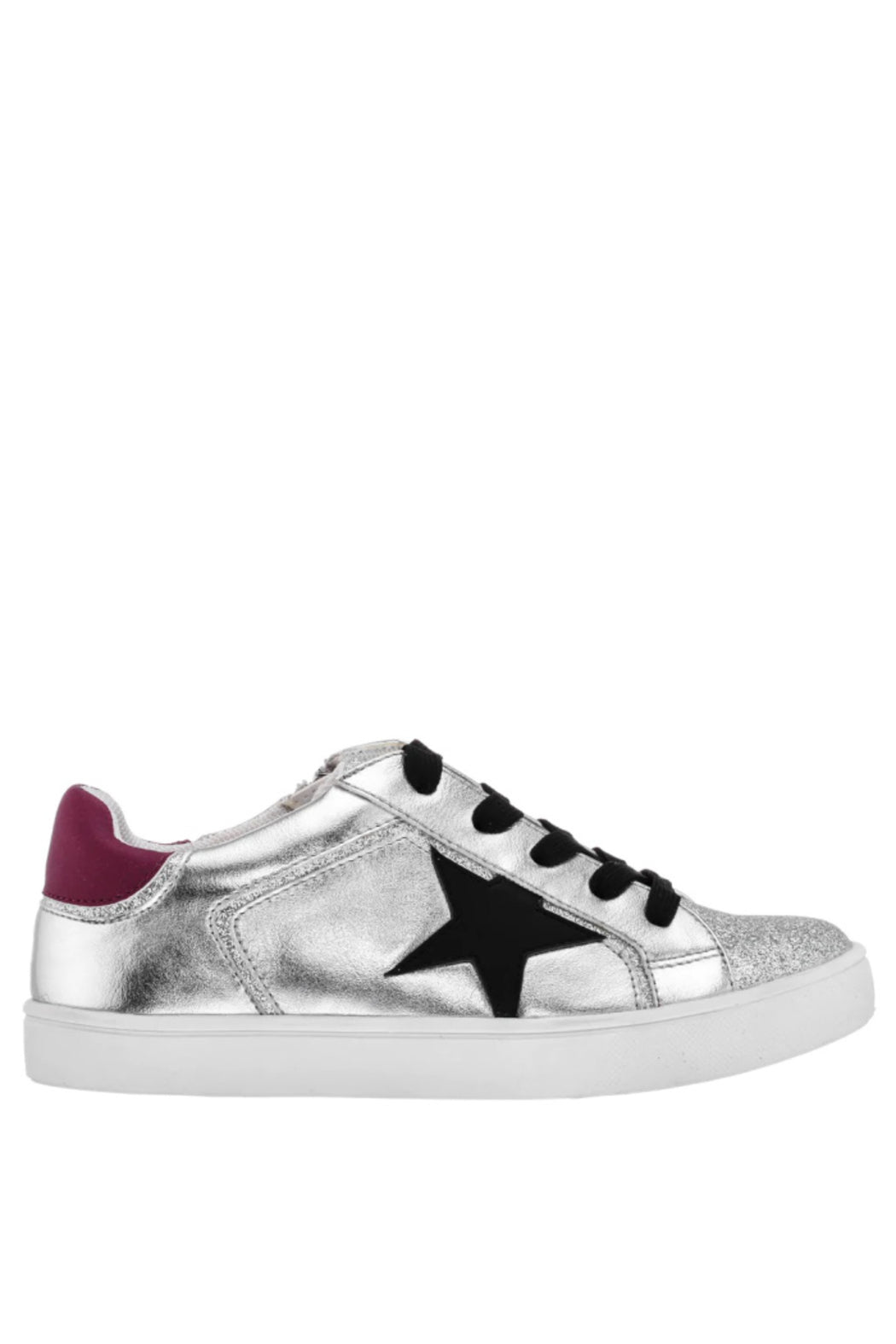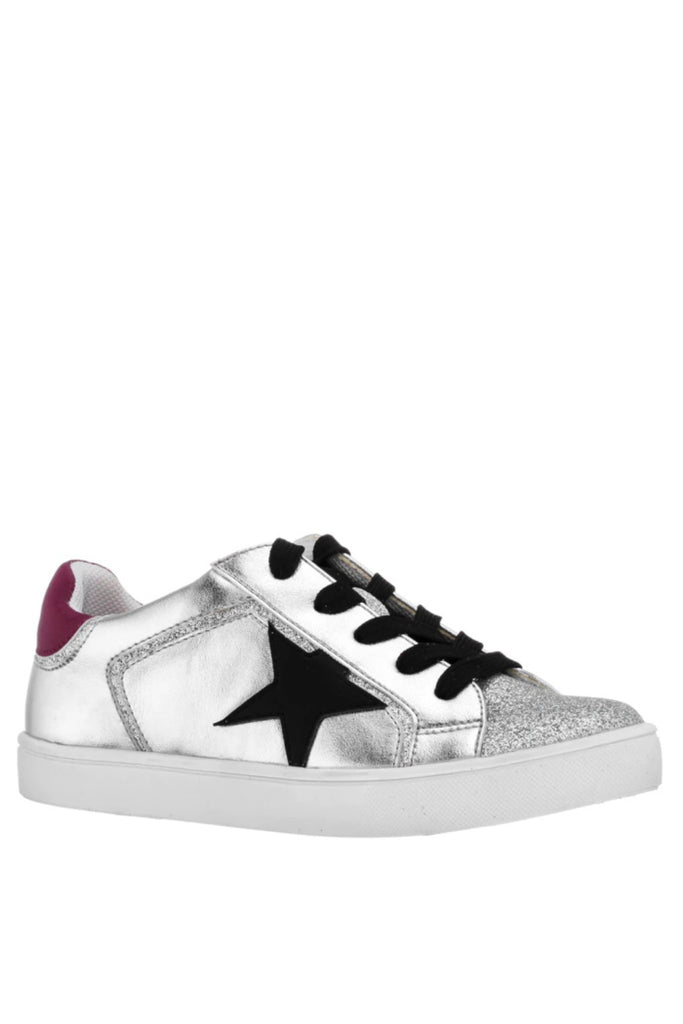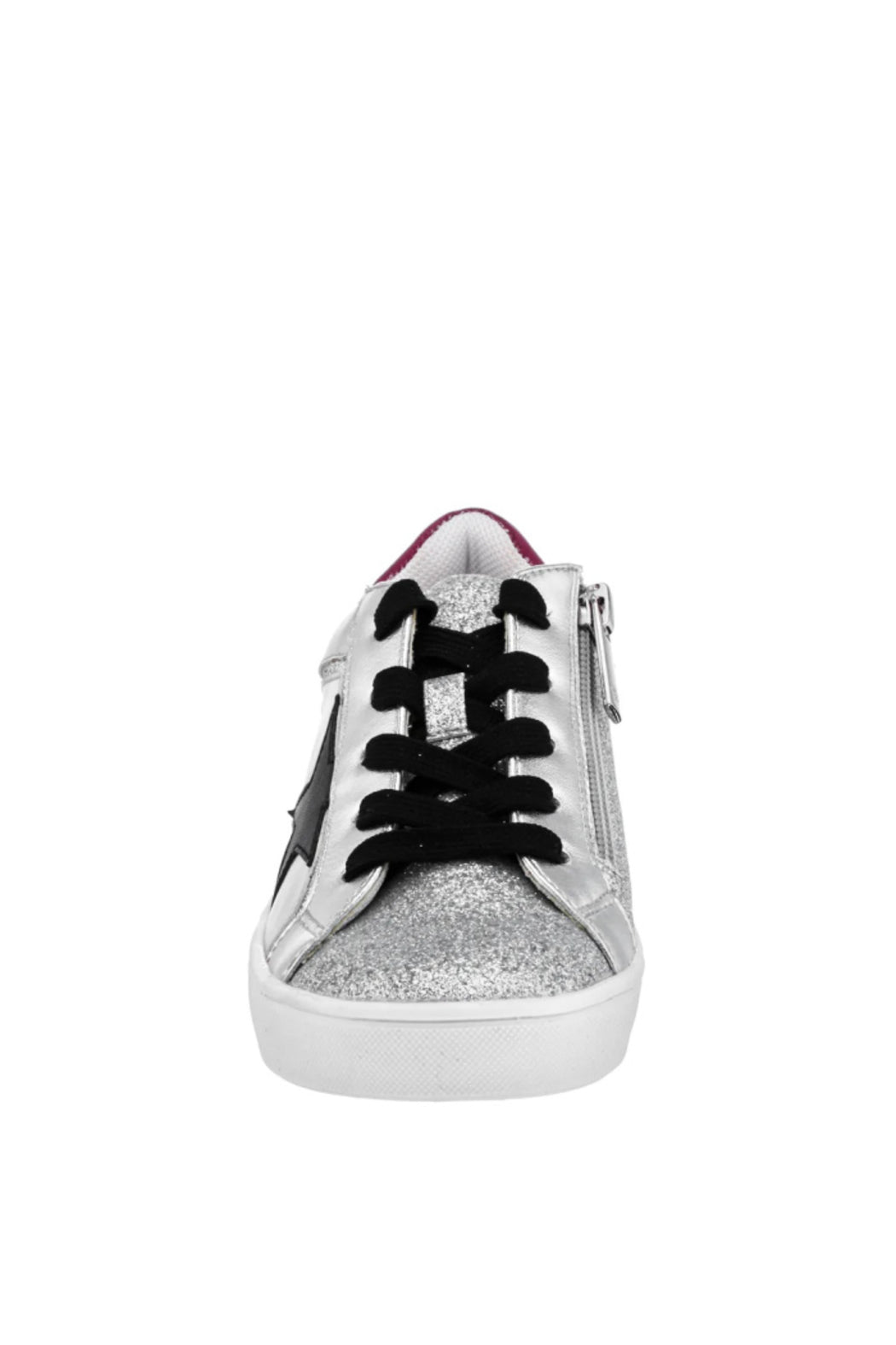 Feel like a star in this low-top sneaker with decorative star applique. Metallic and smooth uppers are accented with glitter to make this style pop. A functional inside zipper for easy-on wear and cushioned memory foam insole make this a stellar choice for everyday!
