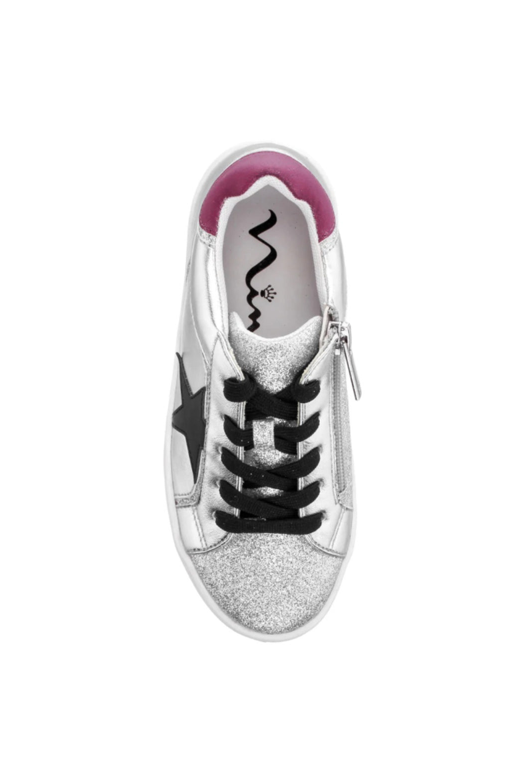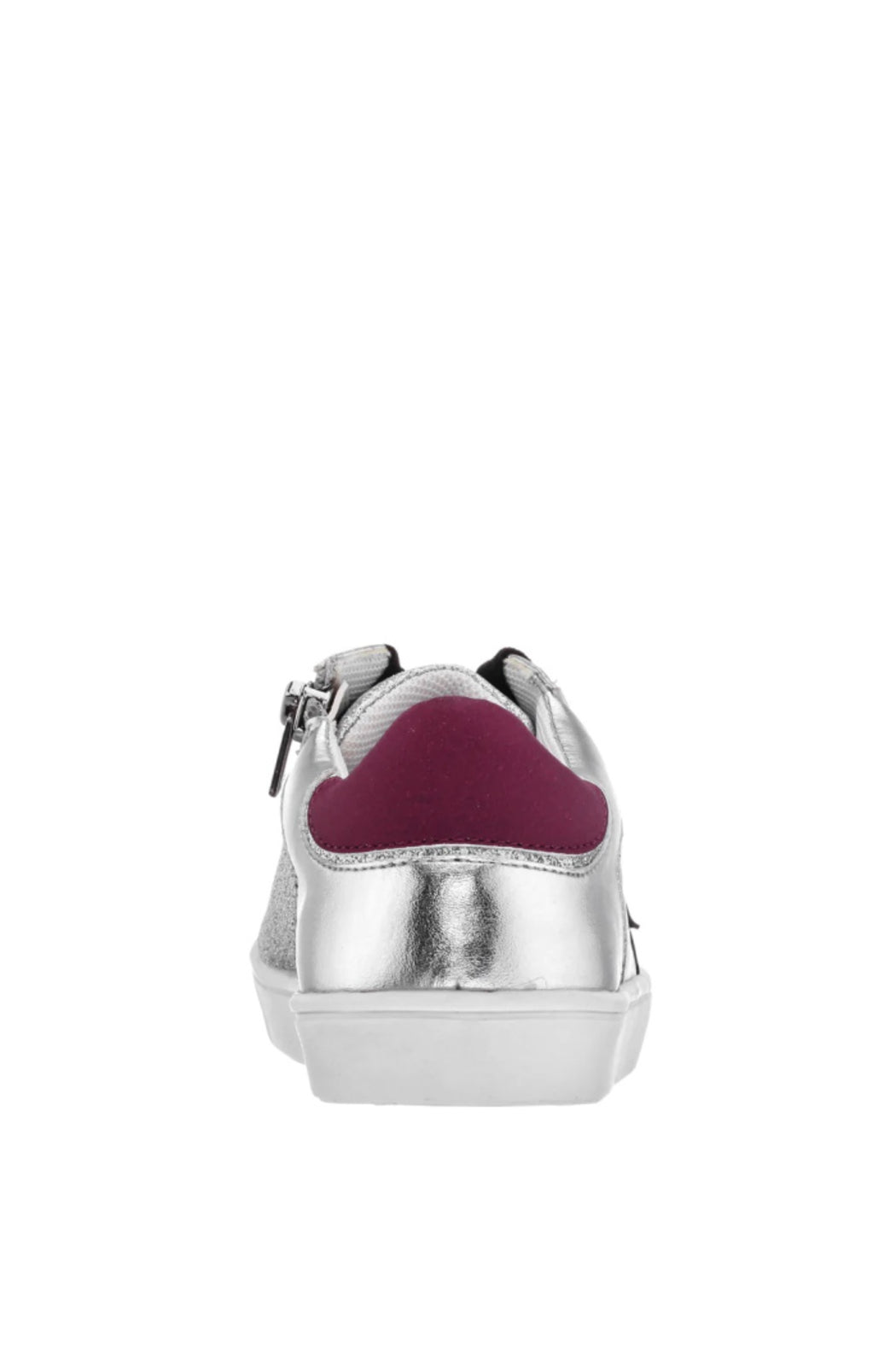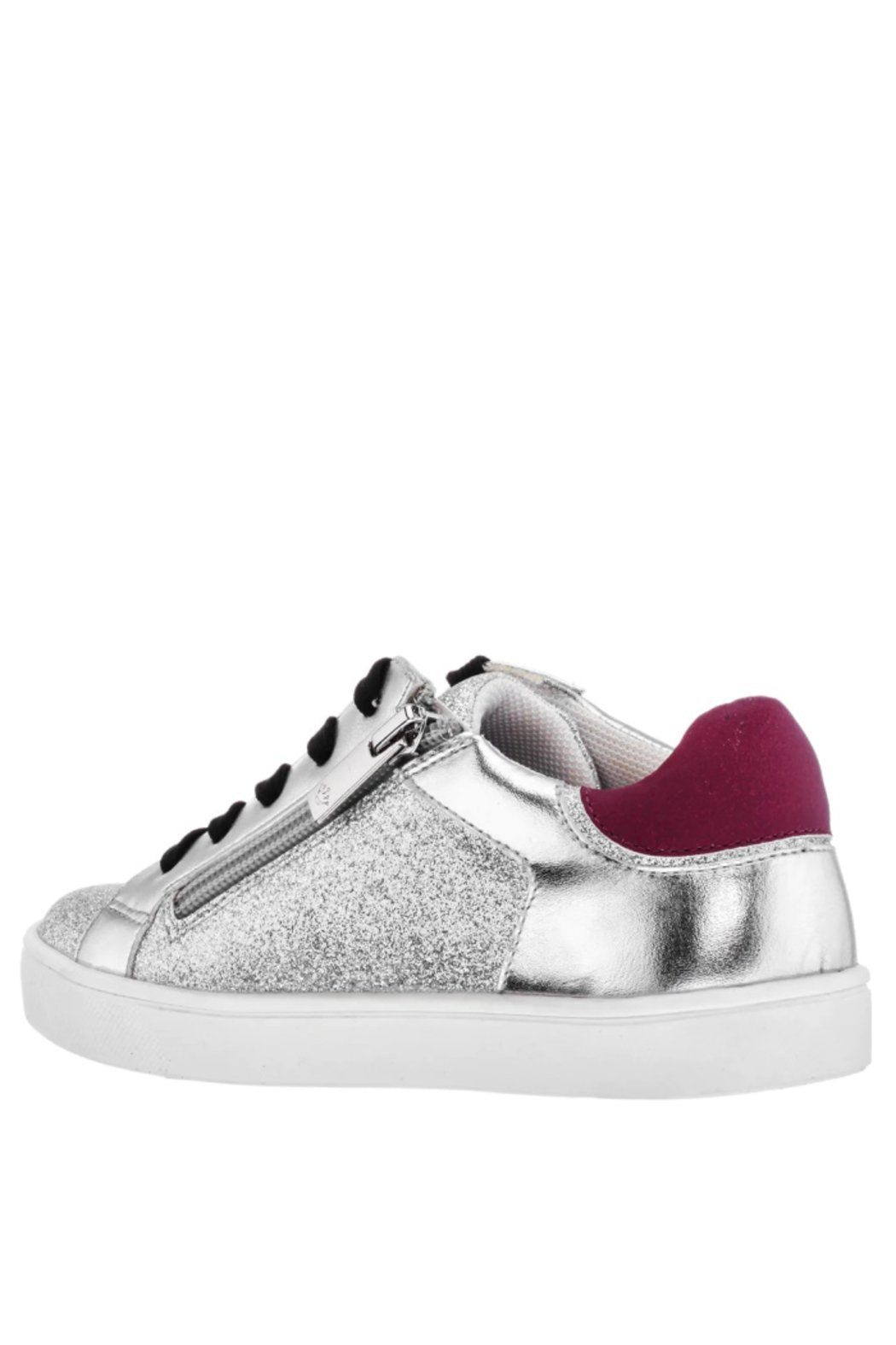 Feel like a star in this low-top sneaker with decorative star applique. Metallic and smooth uppers are accented with glitter to make this style pop. A functional inside zipper for easy-on wear and cushioned memory foam insole make this a stellar choice for everyday!