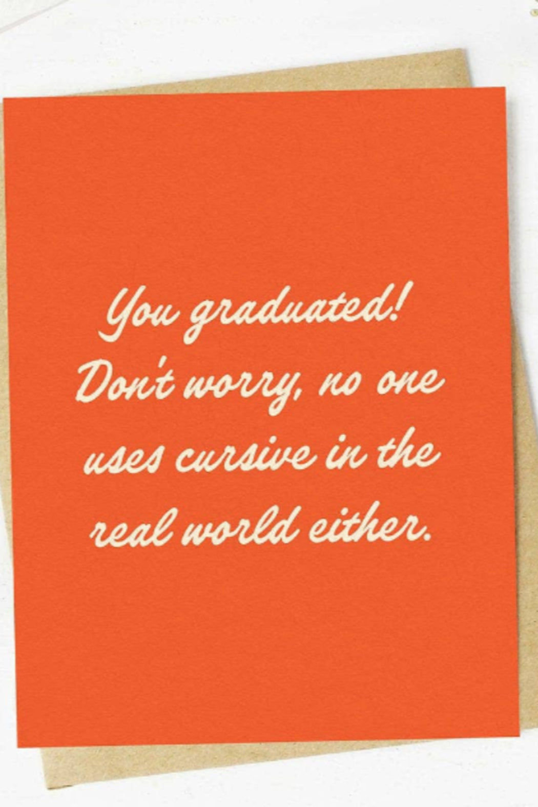 Gift this funny card to a fresh graduate to let them know "no one uses cursive in the real world". -A2 Size (4.25 x 5.5 inches folded). -Printed on premium 16pt thick cardstock with a matte finish. -Paired with a coordinated kraft or holiday color envelope. -BLANK INSIDE -Hand Drawn Categories: graduation card, grad card, celebration card, greeting card, college graduation, high school graduation, masters graduation, phd graduation, cute graduation card, class of 2025, greeting card, graduation gift, funny greeting cards, cursive, funny graduation cards, graduation gift 2025, graduation. Ships in 1-3 business days.