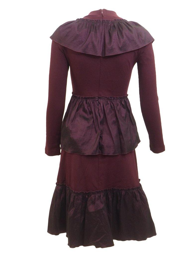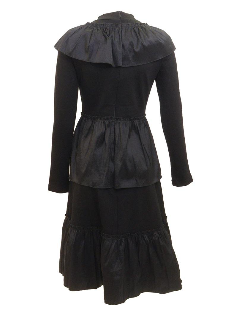 •LOOK: Long sleeved dress with mock turtleneck accented with a taffeta ruffle fabric across the neckline. This knit dress has a fitted bodice and sleeves that leads into a tiered a-line skirt. Taffeta ruffles create accent layers along the dress.