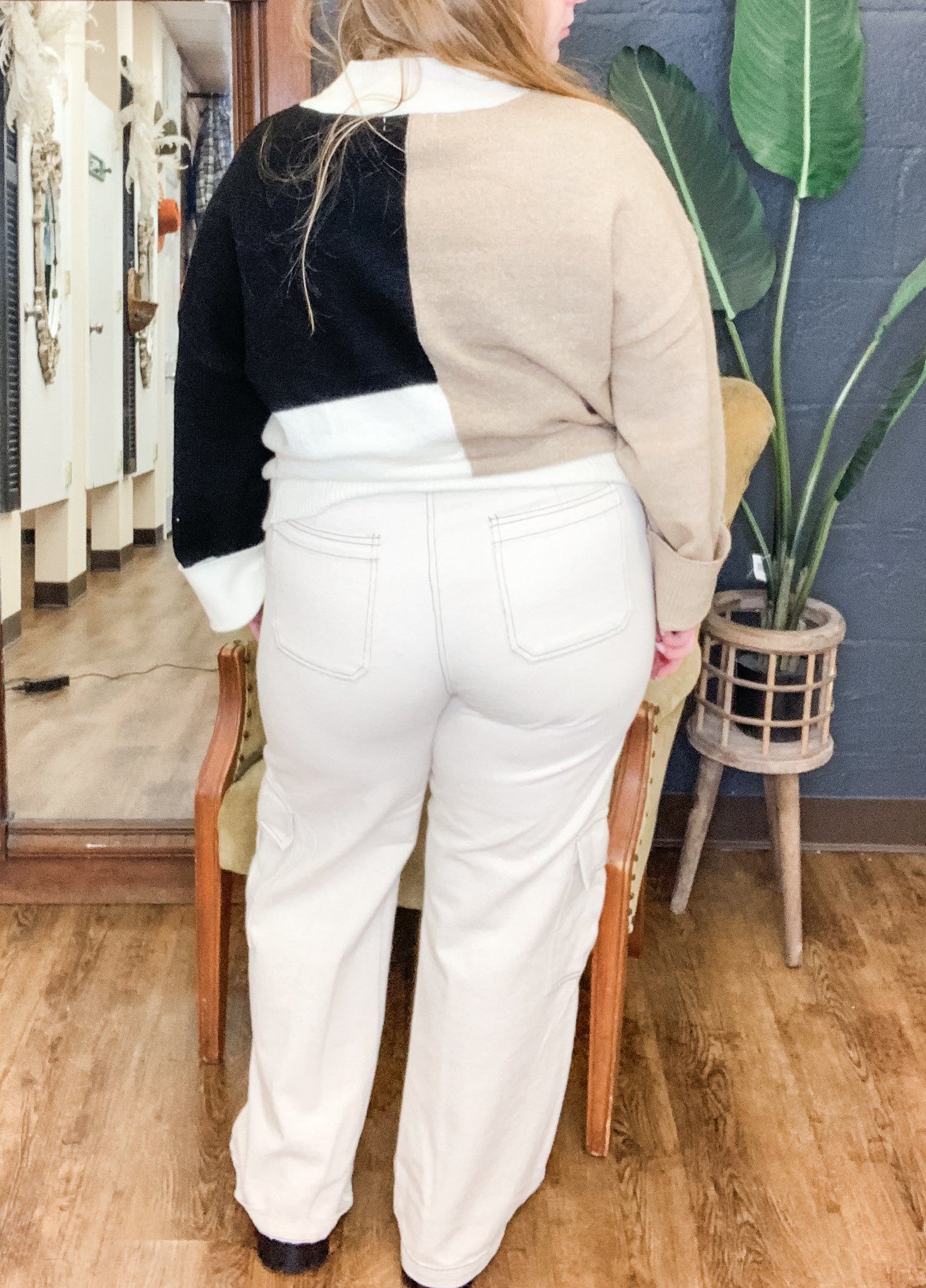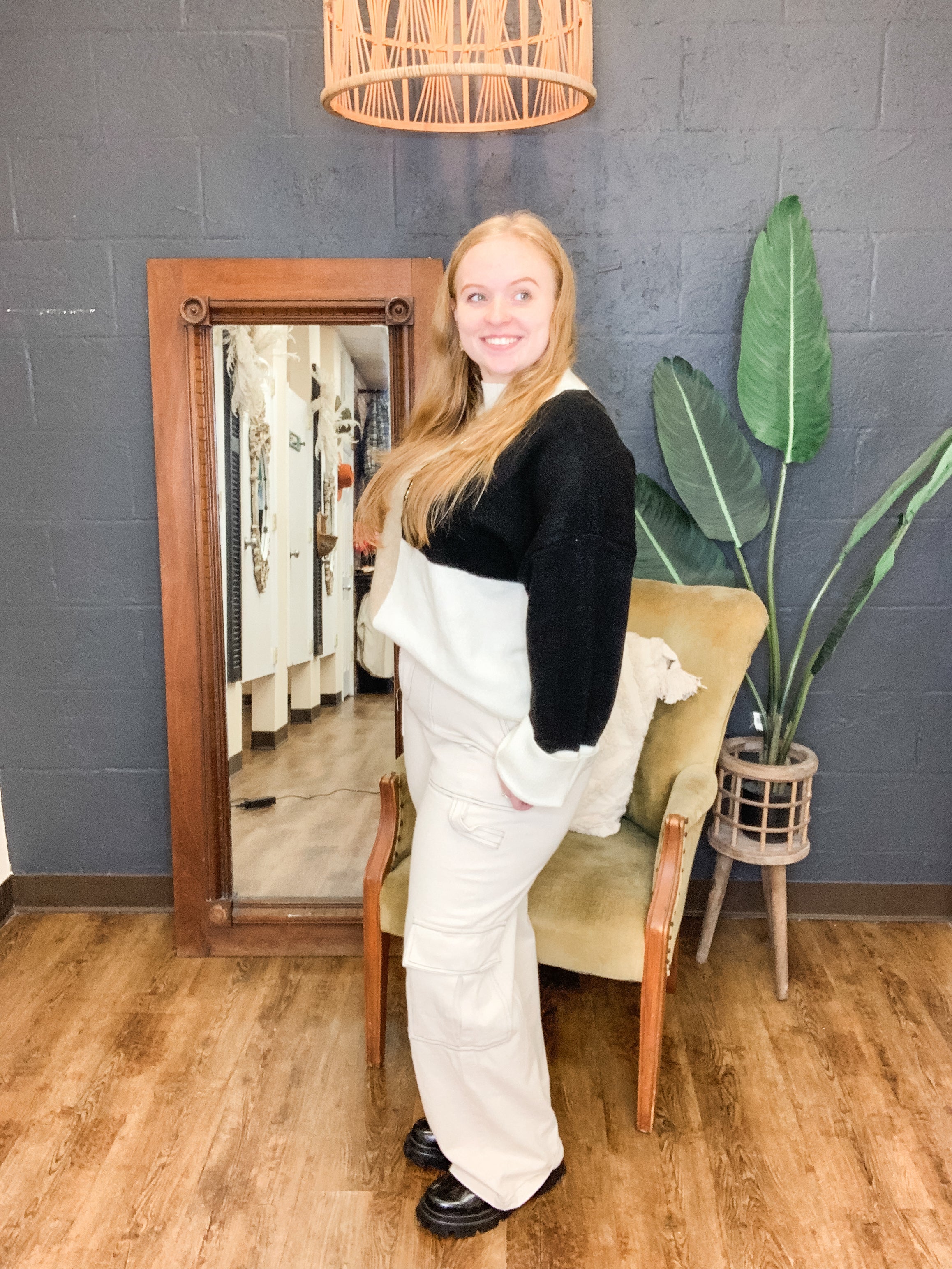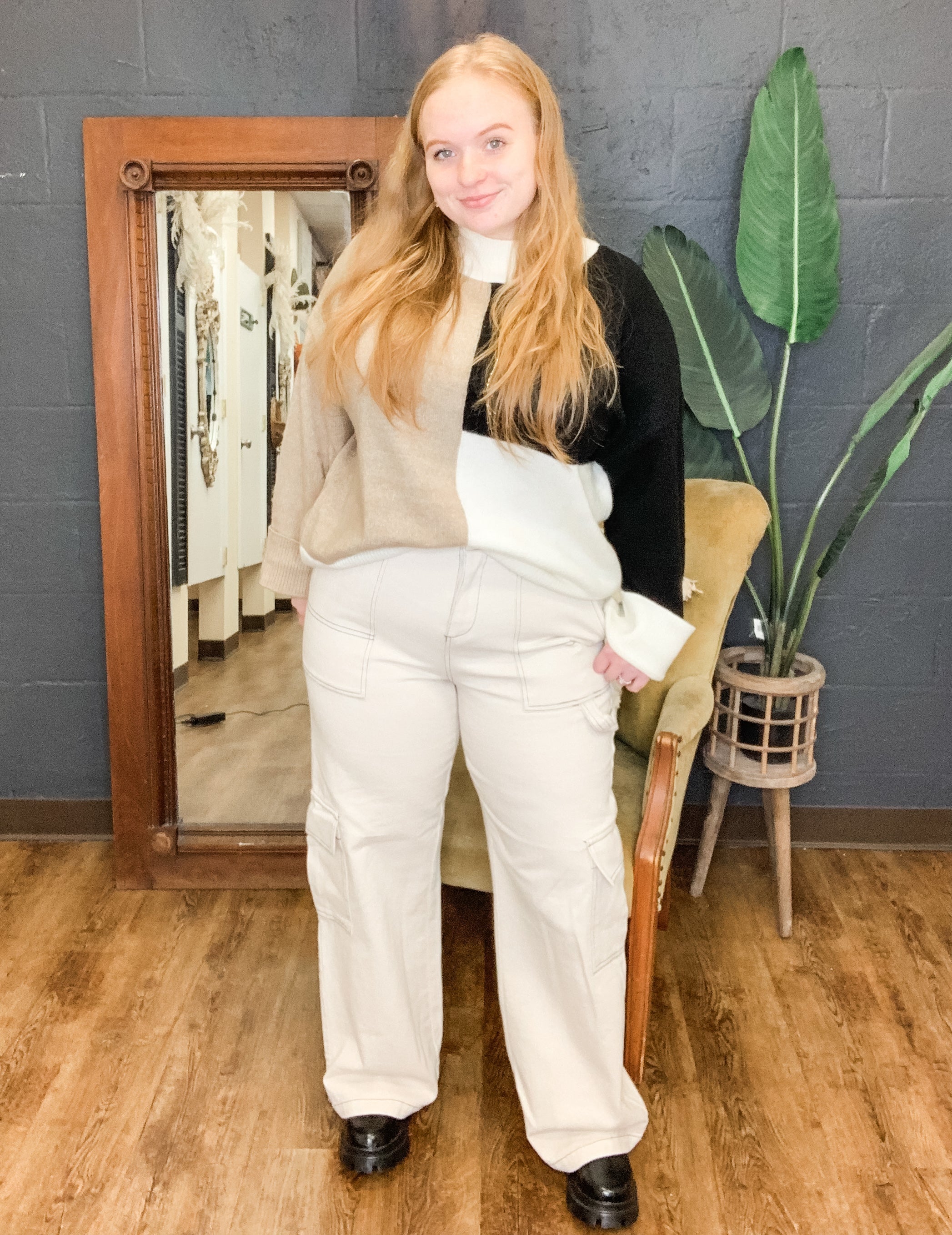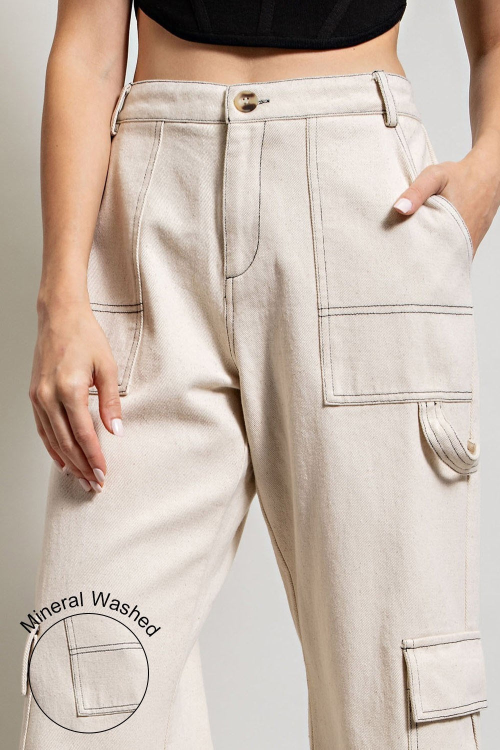 Cargo straight leg pants featuring side hip pockets, back pockets, cargo pockets, and a beautiful seam contrast. These have a relaxed fit, but we recommend purchasing your usual size.