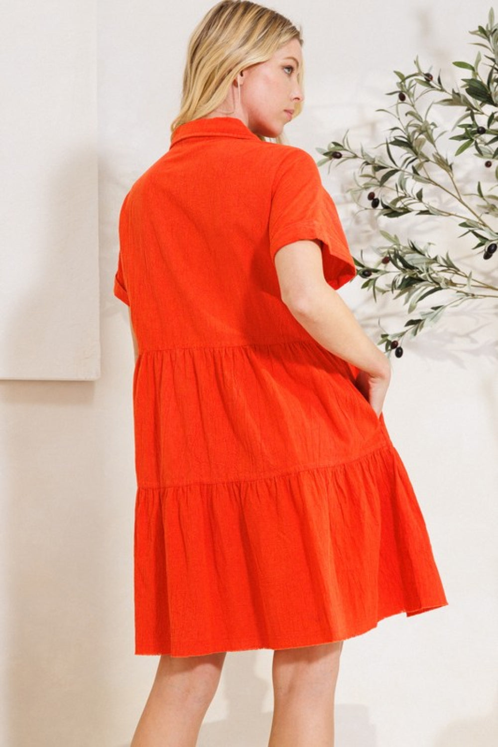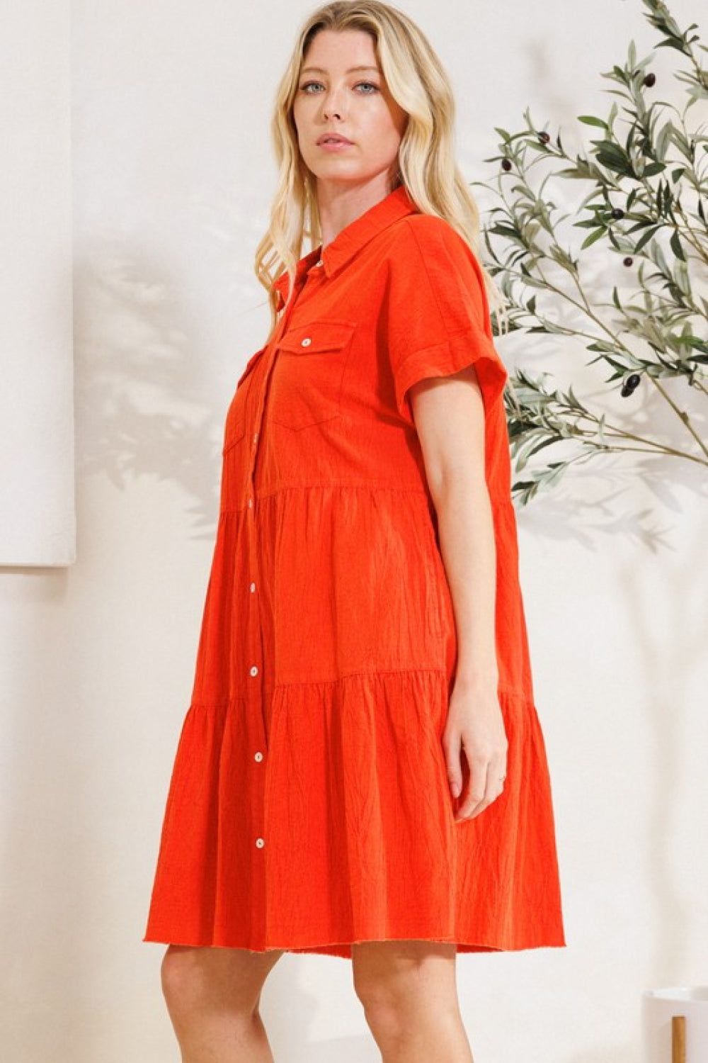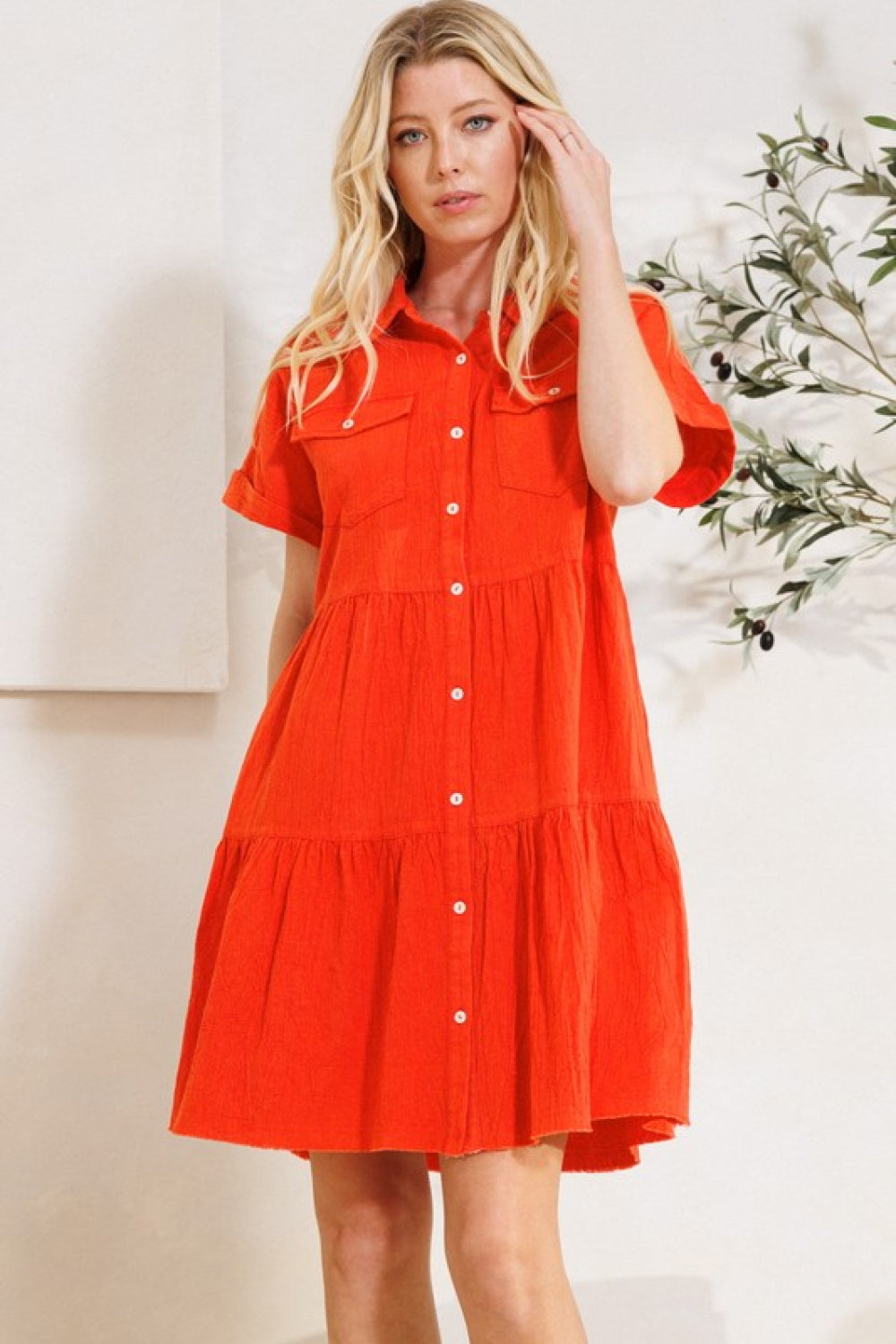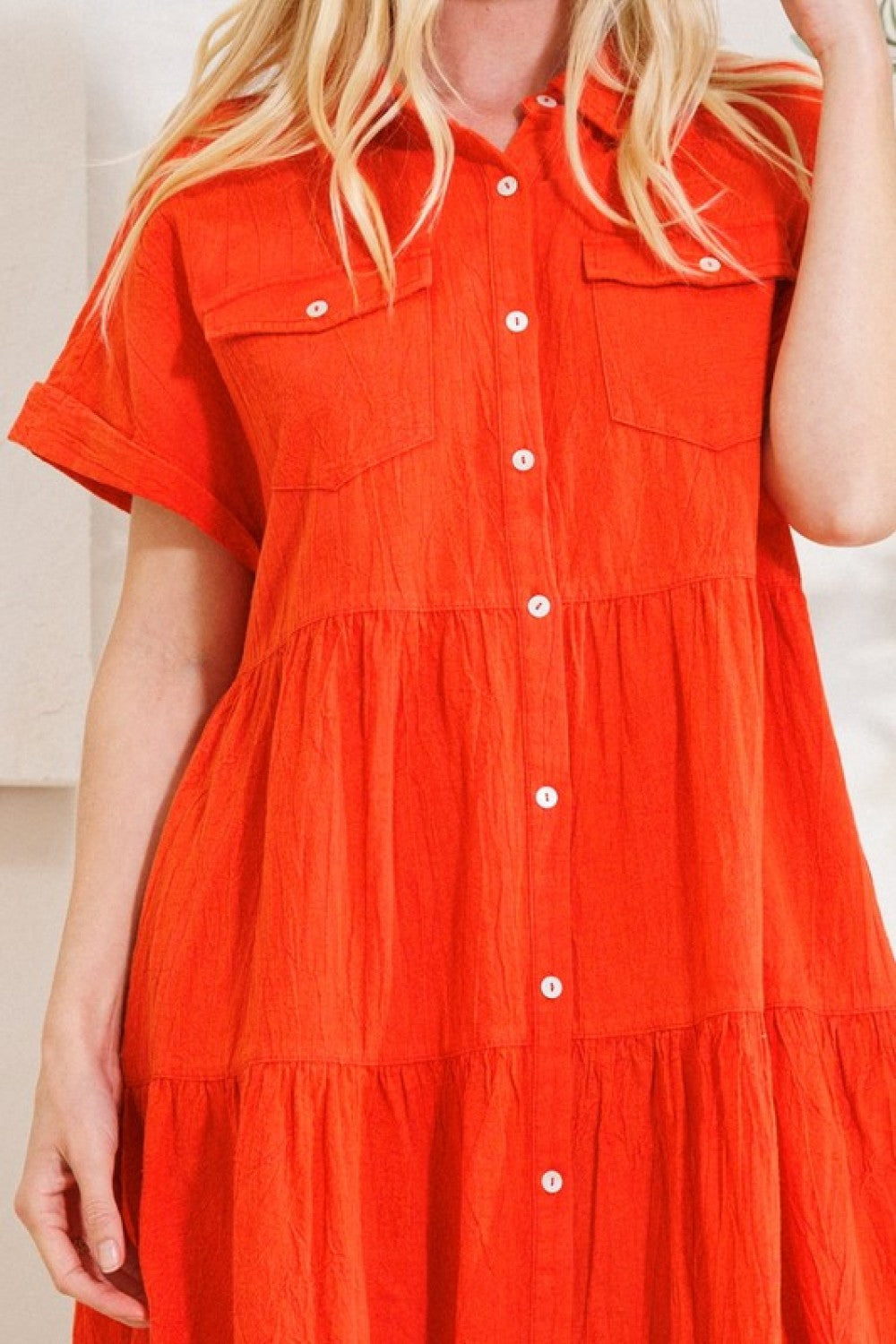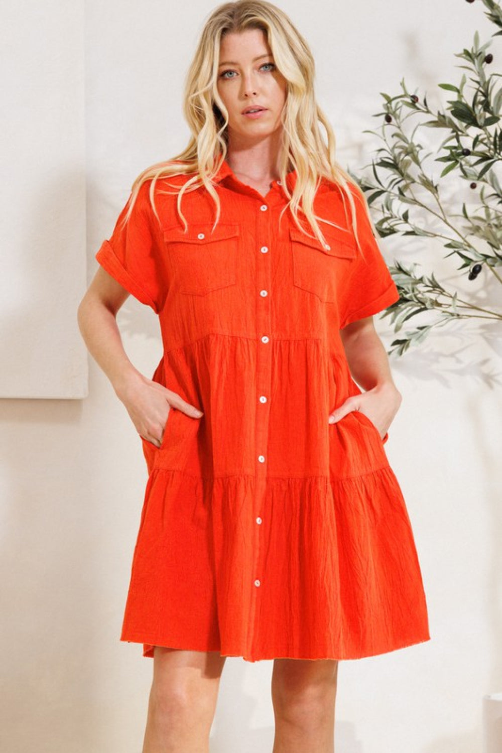 This dress is perfect for summer days. It has a tiered hemline and flap breast pockets, and with short sleeves, it's easy to throw on and go!
