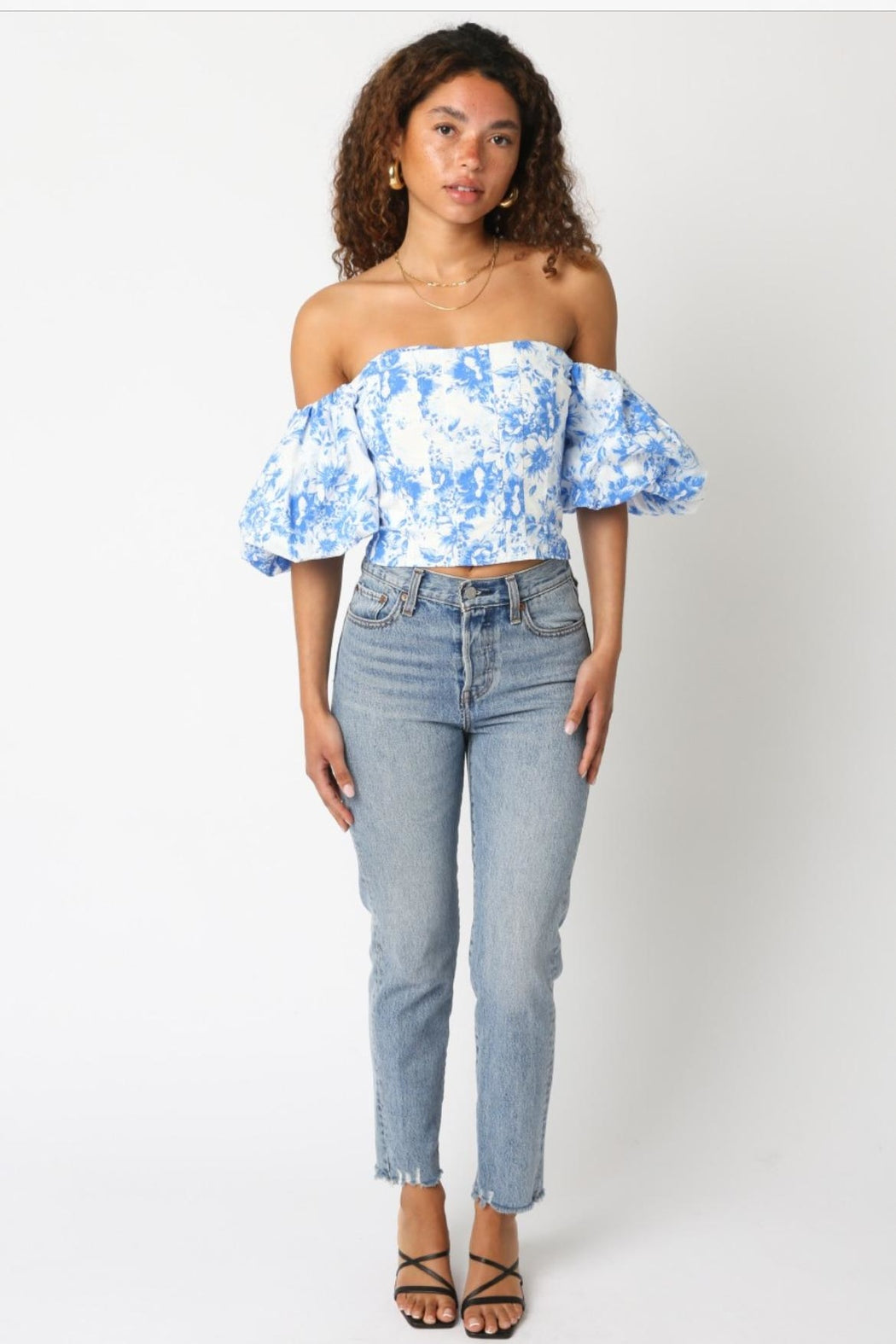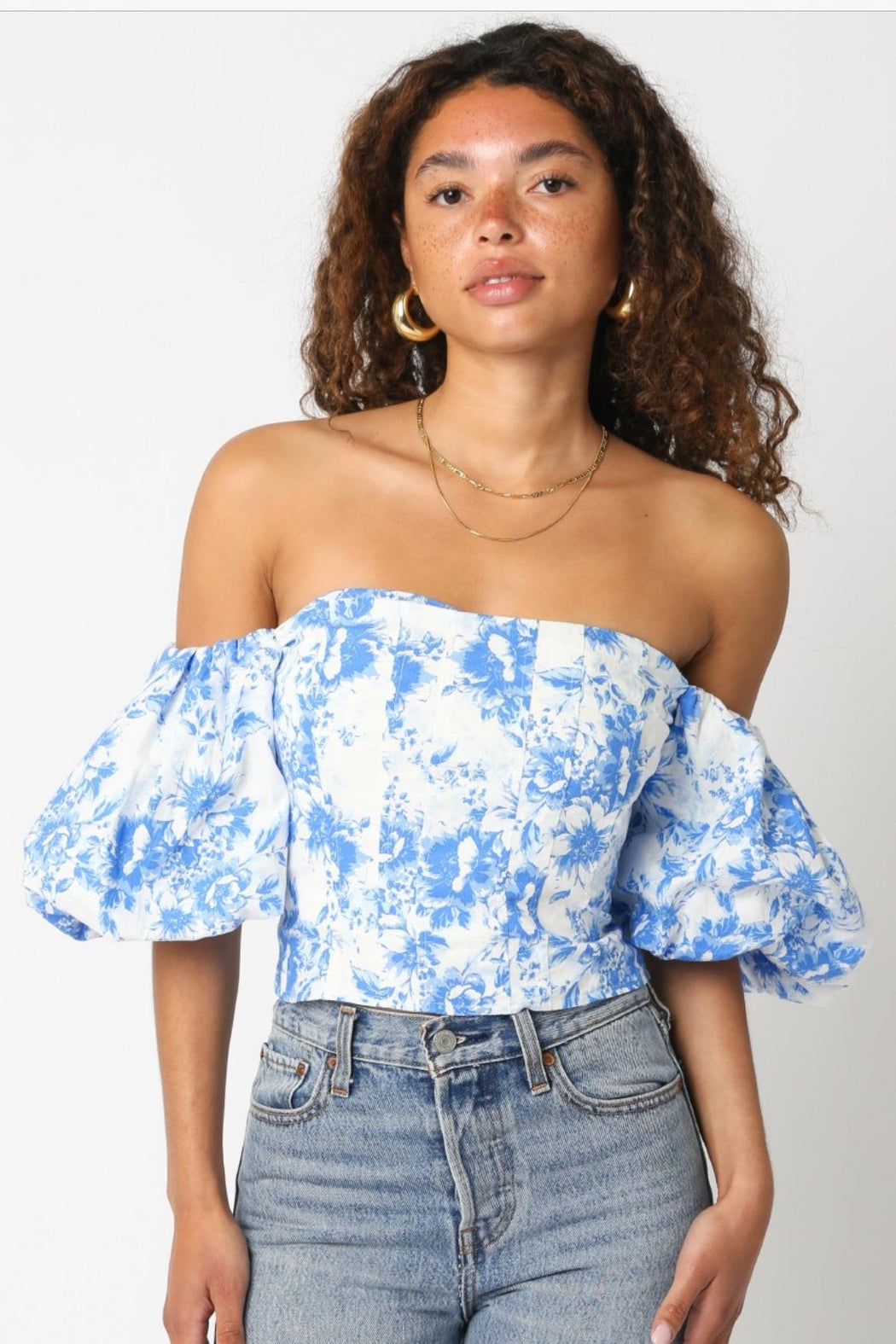 Linen blend off shoulder floral top. Model is wearing a size Small