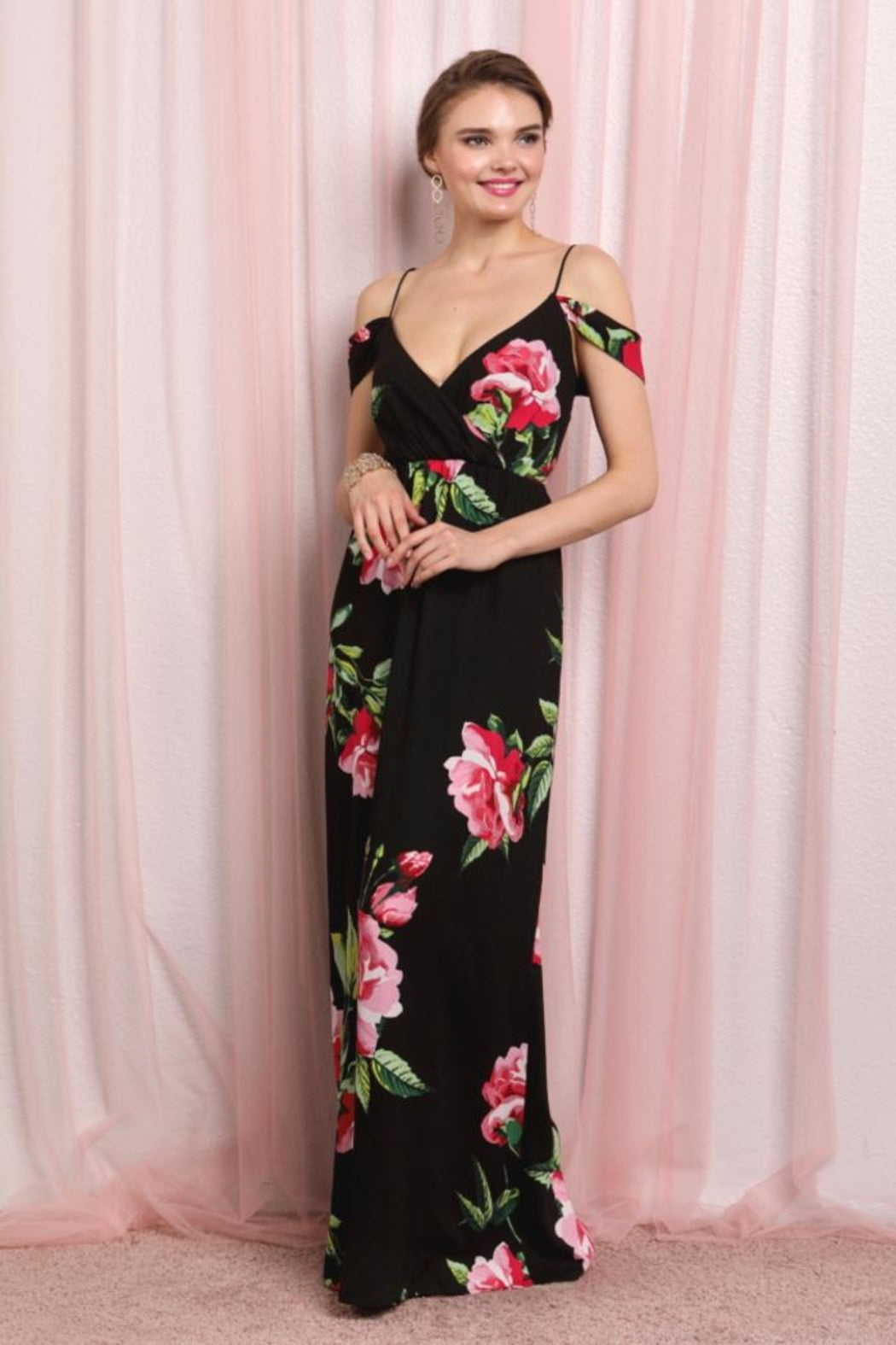 Romantic off shoulder maxi dress features a beautiful pink floral pattern on a black background. Off shoulder sleeves with adjustable spaghetti straps. Skirt is lined to the knee, and has a side slit. Back is open with button closure at bust and elastic at low back. No bra cups, so you may want to add cups or wear an adhesive bra.