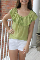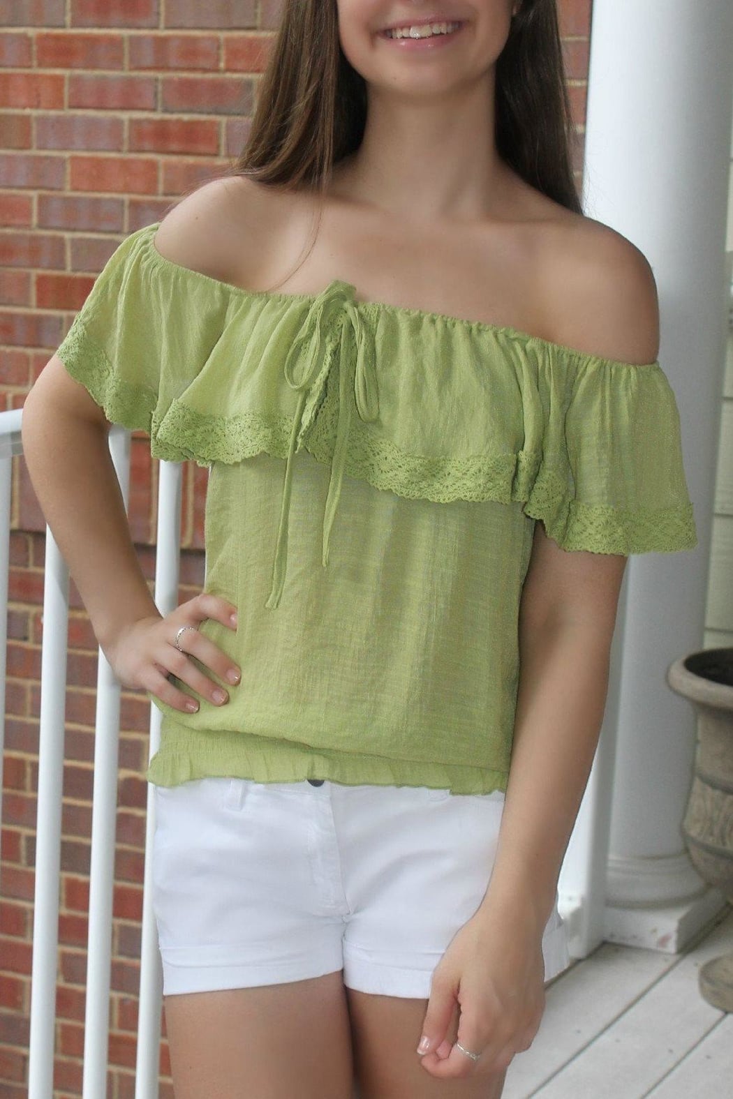 This is a sage colored top, featuring lace, ruffle, and smocking. It can be worn on or off the shoulder. Young Contemporary Sizing