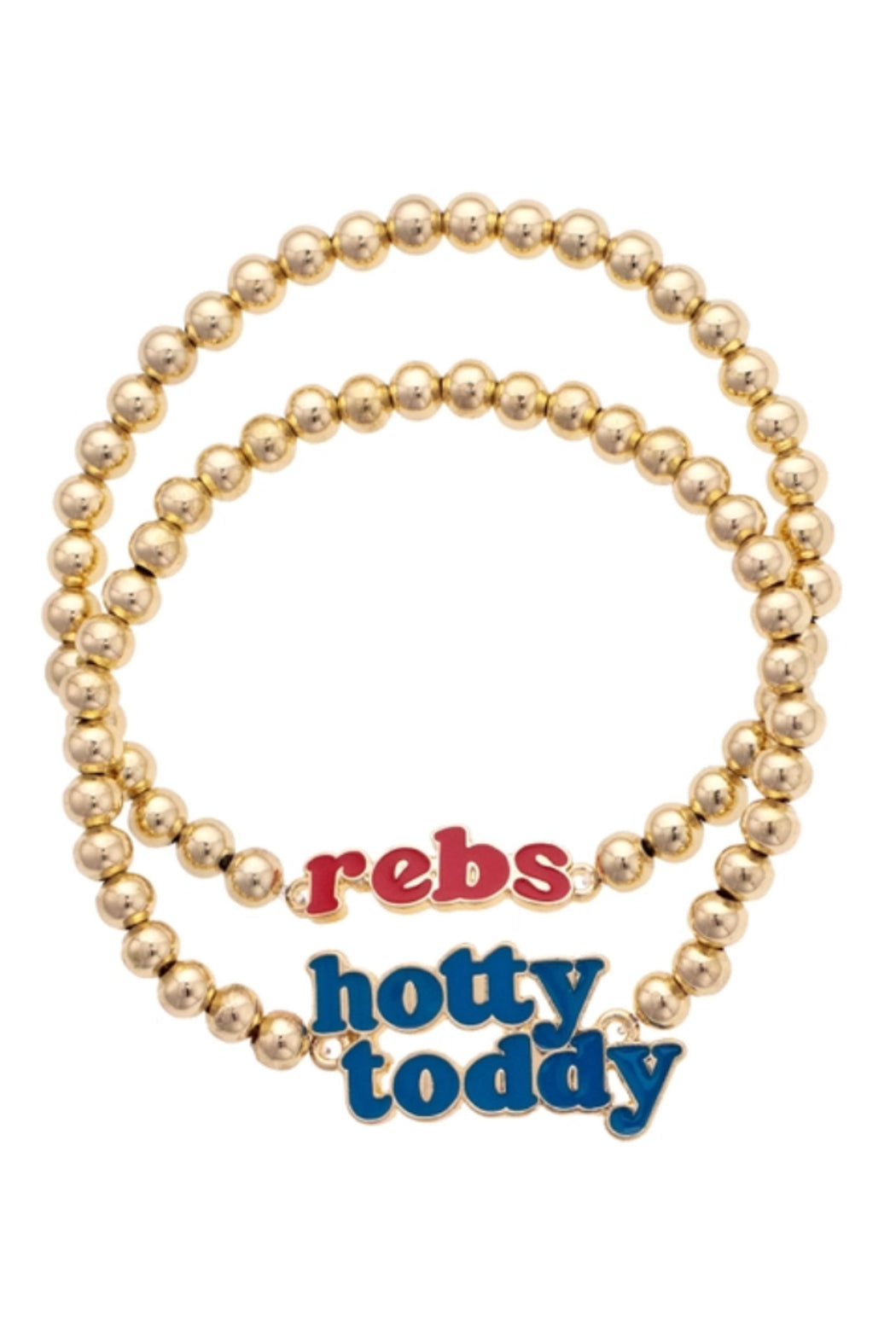 Support your team in style with the Ole Miss Rebels Slogan Ball Bead Bracelet Set of 2. Featuring a combination of red, blue, and shiny gold ball beads, along with the Ole Miss slogan charm, these bracelets add a pop of color and pride to your wrist. DETAILS -Base Metal with Shiny Gold Plating -Stretch -NCAA Officially Licensed