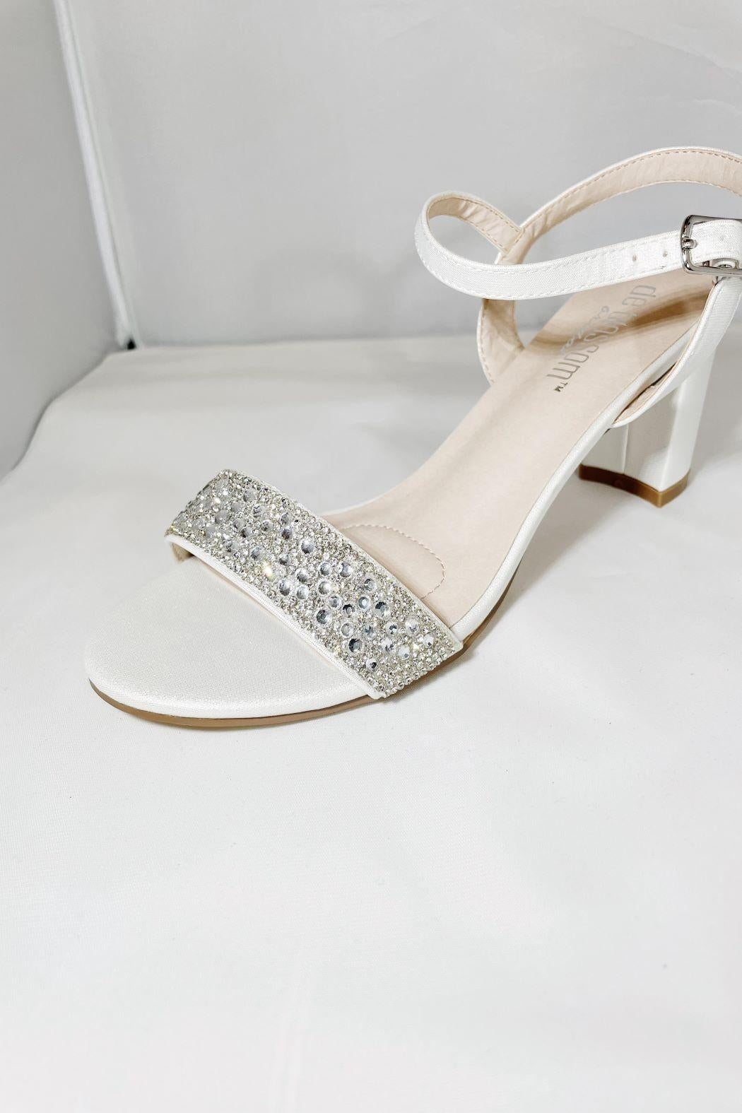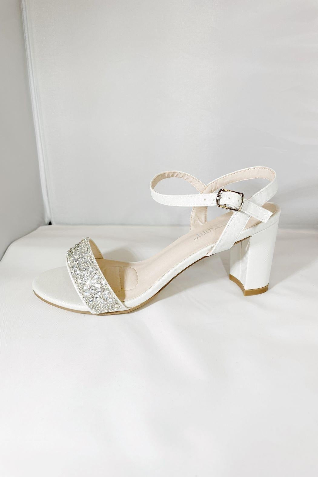This olie white bridal shoe is perfect for your perfect day! This shoe has a 3" heel with padding at the front of the shoe for all day comfort. The ankle straps have adjustable holes in it to make it as tight as you would like it. The front jeweled strap won't catch on anything as they are all glued down.