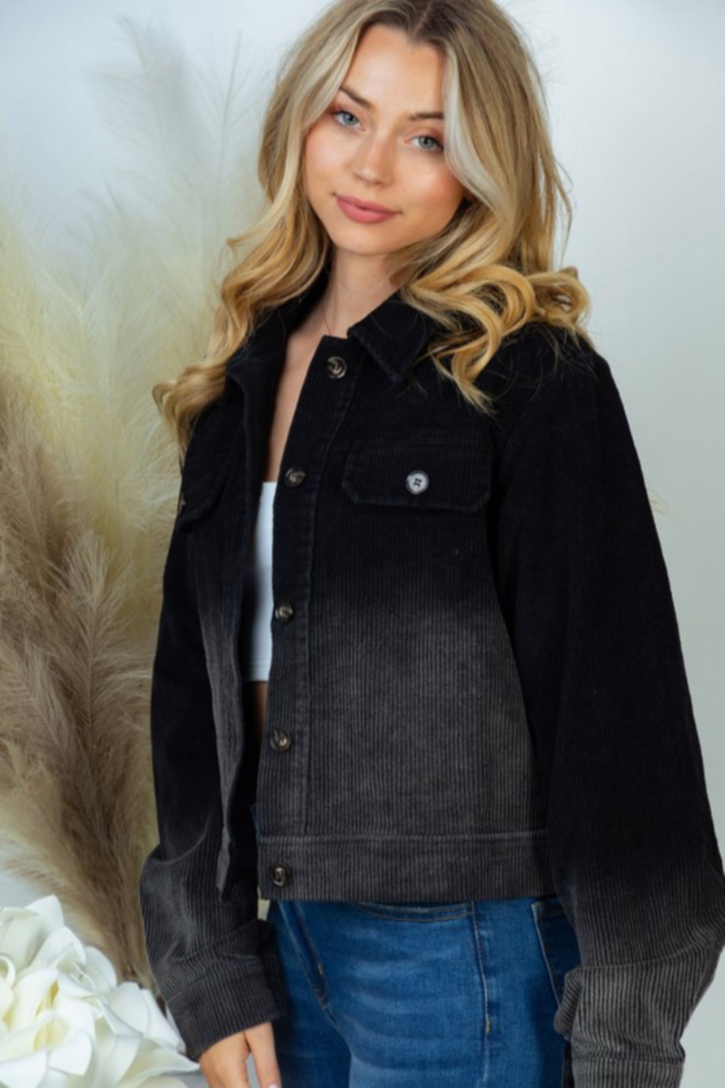 This jacket features - Medium weight corduroy fabric - Ombre pattern - Collared - Button down front - Front patch pockets - Side pockets - Banded bottom - Button on cuff