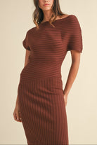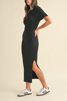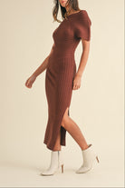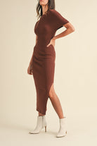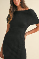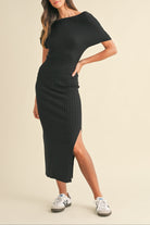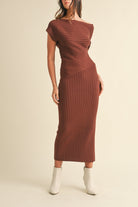 Get ready to turn heads in our One Shoulder Ribbed Knit Midi Dress. With a sexy and elegant one side off shoulder design and stylish side slit, this dress is perfect for making a statement. The ribbed knit fabric offers both comfort and style. Move and groove with ease while looking fabulous.