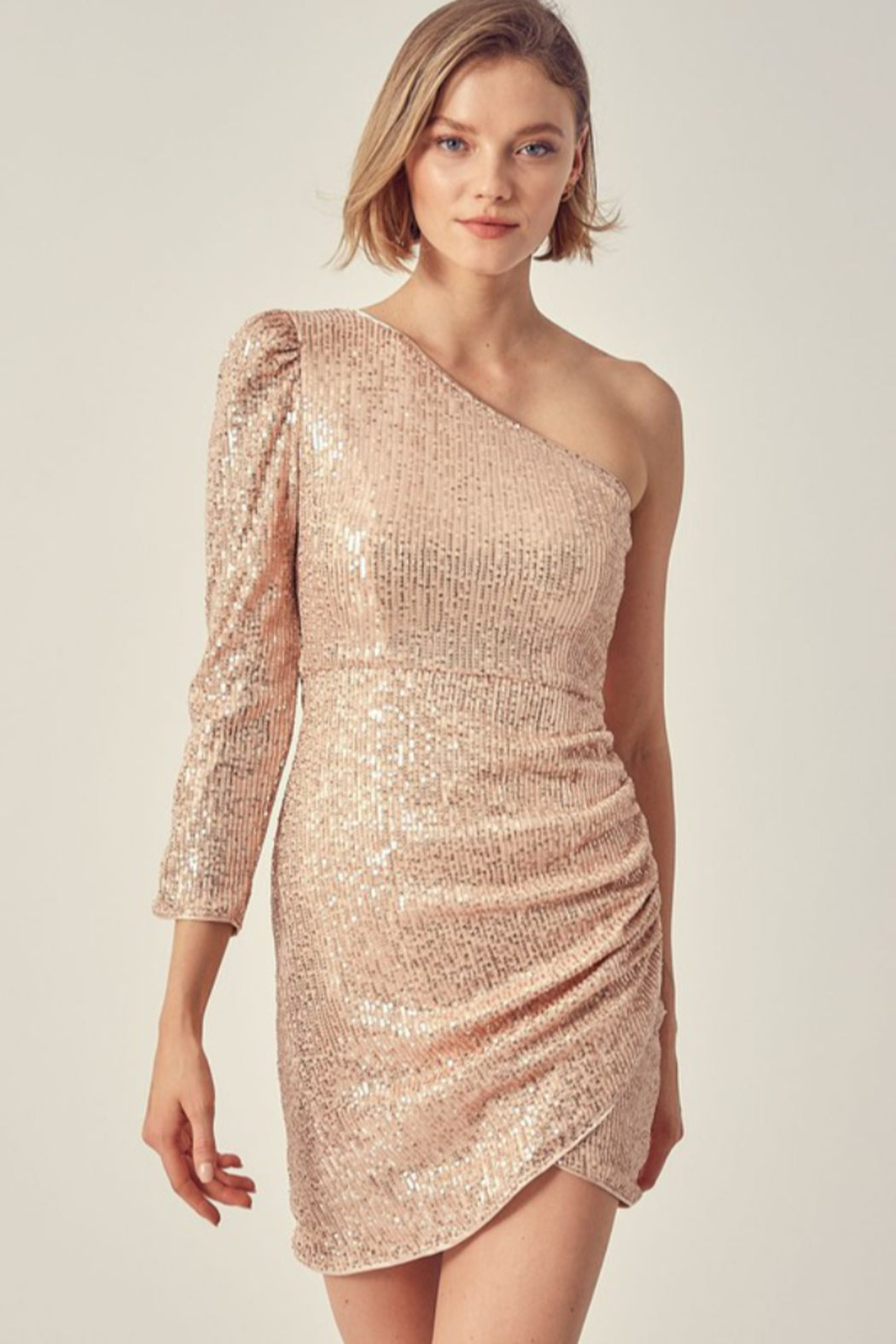 One shoulder surplice sequins mini dress. Lined. Zip closure.