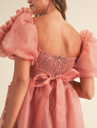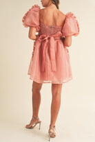 Elevate your style with our Organza Ruffle Mini Babydoll Dress. Featuring a square neckline, ruffle details, and short puff sleeves, this dress is both elegant and unique. The self tie, back smocking, and exposed zipper add extra flair. Perfect for formal occasions, such as engagements and weddings.