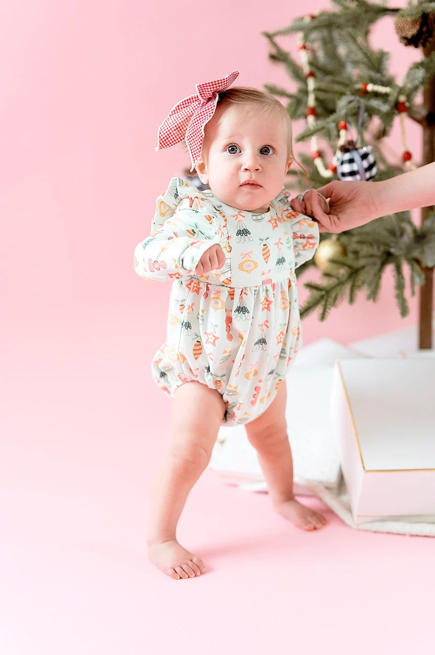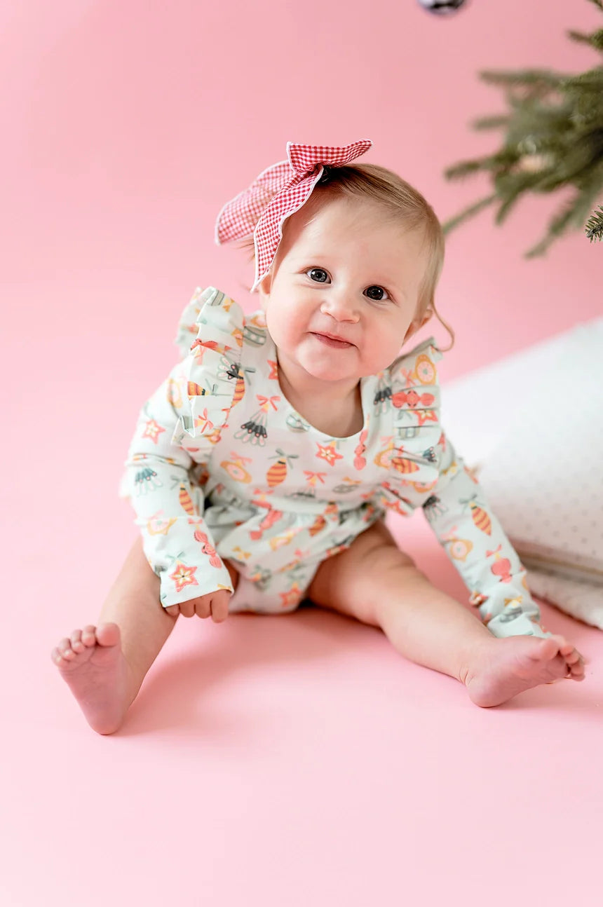 Our Leah Romper features a ruffled detail in front and back, long sleeves and a 3 snap closure for easy diaper changes. Our custom Ornament print by Hey Cute Design is a sure hit for the holidays! 95% cotton 5% spandex Wash in cold with like colors Lay flat to dry for longer wear