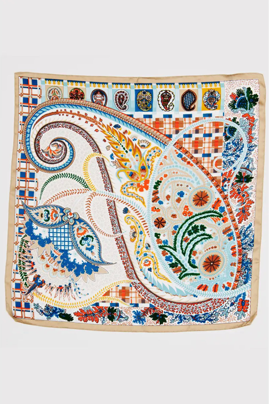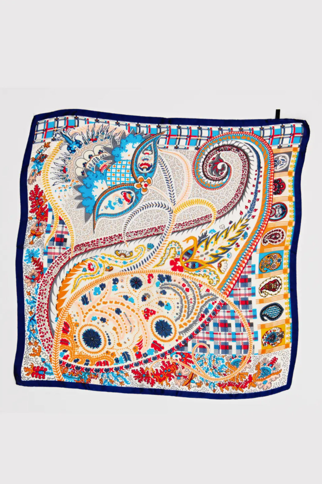 A new popular trending scarf features a gorgeous ornate paisley design square scarf design. A chic must have for this Spring season!